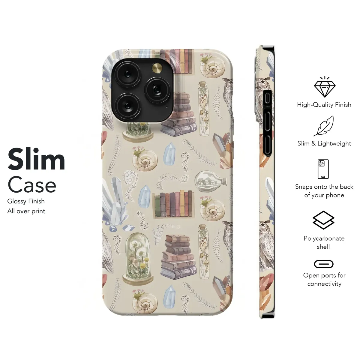 Wrap your device in whimsical wonder with this enchanting bohemian-inspired design! Featuring a repeating pattern of watercolor-style illustrations, this design is a medley of natural curiosities and mystical elements. Majestic owls perch amongst sparkling crystals, stacks of aged books, delicate ferns, and miniature cloches filled with wildflowers. A touch of earthy magic is added with detailed seashells and intriguing potion bottles. This unique pattern is perfect for anyone who loves nature, vintage aesthetics, and a touch of the otherworldly. Accessorize your tech with this unique, artistic, whimsical, and bohemian accessory. Ideal for nature lovers, bookworms, and those seeking a touch of magic in their everyday lives. Grab this must-have accessory and showcase your unique style with this captivating design!