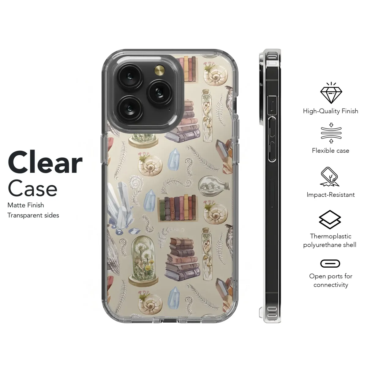 Wrap your device in whimsical wonder with this enchanting bohemian-inspired design! Featuring a repeating pattern of watercolor-style illustrations, this design is a medley of natural curiosities and mystical elements. Majestic owls perch amongst sparkling crystals, stacks of aged books, delicate ferns, and miniature cloches filled with wildflowers. A touch of earthy magic is added with detailed seashells and intriguing potion bottles. This unique pattern is perfect for anyone who loves nature, vintage aesthetics, and a touch of the otherworldly. Accessorize your tech with this unique, artistic, whimsical, and bohemian accessory. Ideal for nature lovers, bookworms, and those seeking a touch of magic in their everyday lives. Grab this must-have accessory and showcase your unique style with this captivating design!