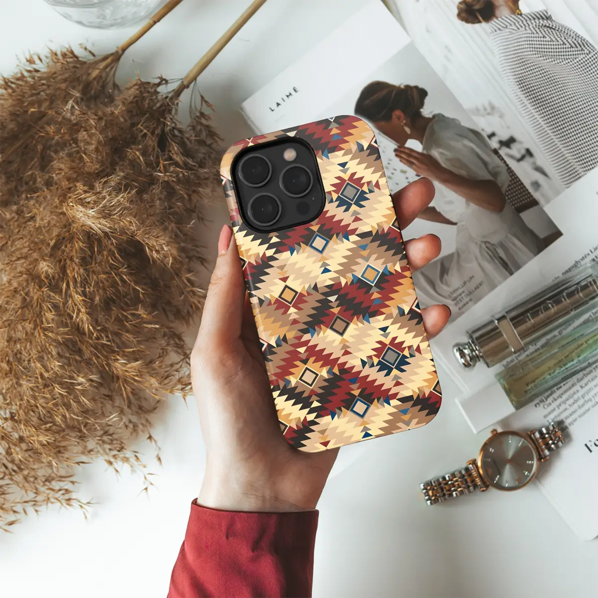 Accessorize your phone with a touch of Southwest style with our Navajo Tribal Geometric Phone Case. This eye-catching case features an intricate geometric pattern inspired by traditional Navajo designs, showcasing bold colors and sharp angles. The durable construction ensures protection for your device from scratches and drops, while the sleek design complements any outfit. Whether you're using an iPhone, Samsung, or Pixel, this case makes a statement wherever you go.