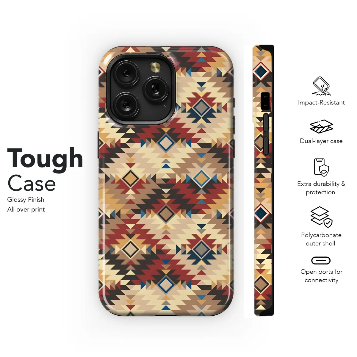 Accessorize your phone with a touch of Southwest style with our Navajo Tribal Geometric Phone Case. This eye-catching case features an intricate geometric pattern inspired by traditional Navajo designs, showcasing bold colors and sharp angles. The durable construction ensures protection for your device from scratches and drops, while the sleek design complements any outfit. Whether you're using an iPhone, Samsung, or Pixel, this case makes a statement wherever you go.