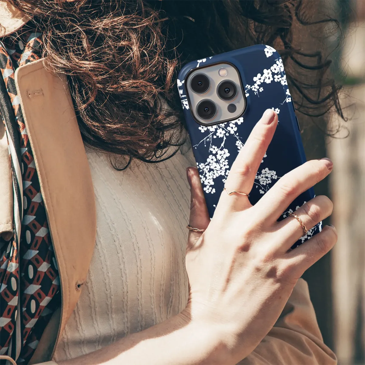 Immerse yourself in the tranquil beauty of our stunning botanical design, showcasing delicate white blossoms spread across a rich, deep navy blue background. This elegant pattern features intricate branches laden with beautiful flowers, evoking the serenity of a springtime garden. The crisp white blooms contrast strikingly against the dark blue, creating a captivating aesthetic that is both timeless and modern. Inspired by classic Japanese floral motifs and the charm of cherry blossoms, this artwork brings nature's artistry to your everyday items. It's a piece of art telling a story of natural beauty and sophistication. Perfect for adding unique, stylish flair to personal accessories, this design transforms the ordinary into the extraordinary. Imagine carrying this exquisite artwork, a constant reminder of natural elegance and artistic detail. The gentle sway of branches and scattered blossoms creates a dynamic, harmonious composition. This intricate floral print is ideal for those who appreciate botanical illustrations, elegant design, and serene beauty. Elevate your style with this sophisticated pattern, a blend of classic inspiration and contemporary appeal, perfect for a distinctive touch on your favorite accessory.