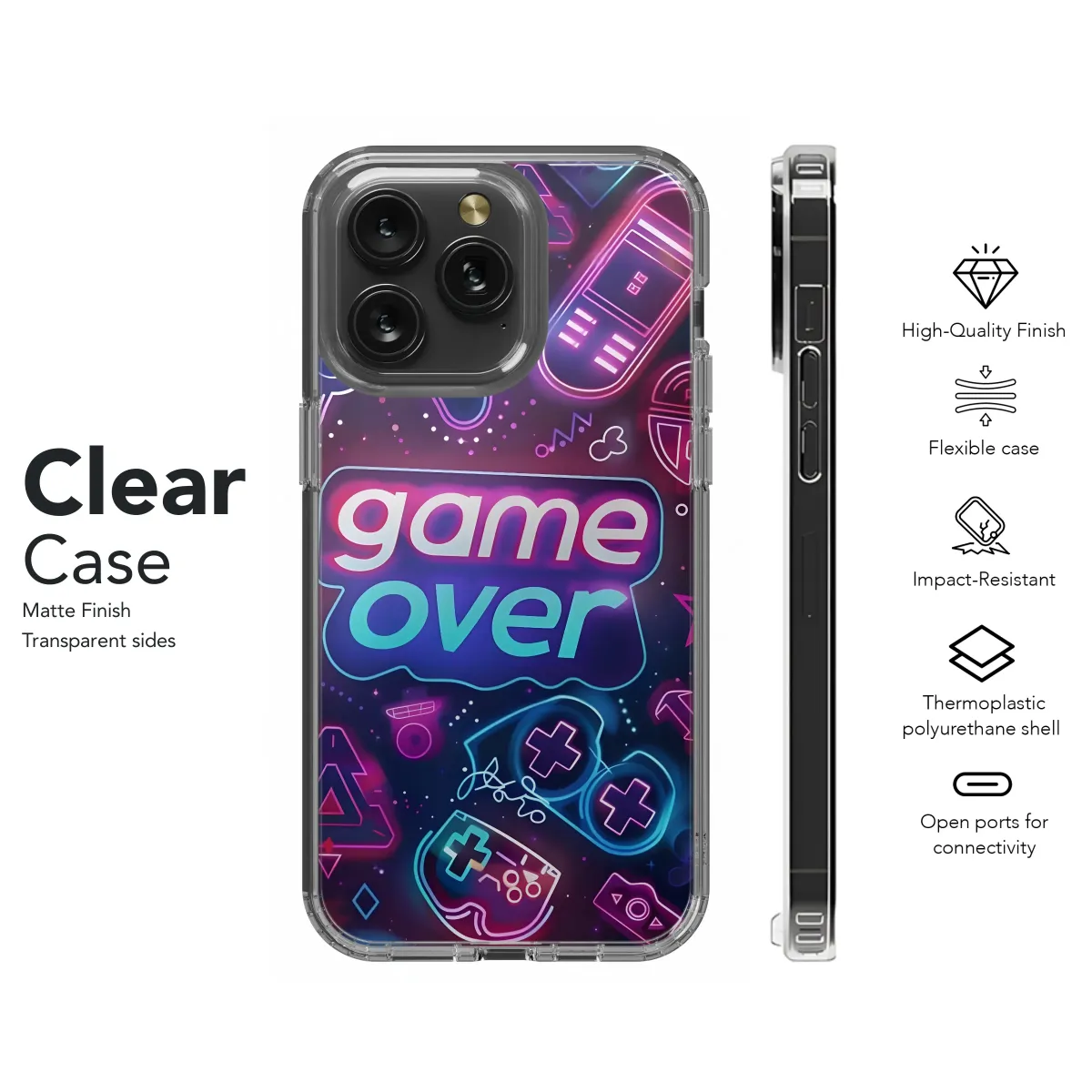 Level up your style with this vibrant, retro-gaming-inspired design. Featuring a neon "Game Over" graphic alongside iconic controller symbols and pixelated elements, this bold print is perfect for showcasing your love of classic arcade games and 80s aesthetics. The eye-catching color palette of pinks, purples, and blues creates a truly electrifying look, making it a must-have accessory for any gamer or retro enthusiast. This high-quality, durable print offers vivid colors and crisp details, ensuring your device stays protected while expressing your unique personality. Express your inner gamer with this electrifying design that captures the energy and nostalgia of the golden age of gaming. It's a conversation starter and a stylish way to personalize your tech, turning your everyday device into a vibrant reflection of your passions. Show off your gaming pride with this totally rad accessory, making a statement wherever you go! This design is sure to be a hit with gamers, retro lovers, and anyone who appreciates a bold, unique aesthetic. Get yours today and prepare for endless compliments! #retro gaming #80s #neon #gamer #videogames #retrowave #synthwave #arcade #pixelart #gameover #accessories #personalized #techstyle