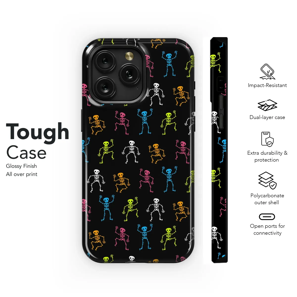 Add some spooky fun to your everyday essentials with this vibrant, colorful skeleton design. These playful, dancing skeletons in a variety of bright hues against a sleek black background create a unique and eye-catching pattern perfect for showcasing your personality. The bold, graphic style offers a modern twist on classic Halloween imagery, making it a stylish choice year-round. This design is printed using high-quality inks for vibrant colors and long-lasting durability, ensuring your new accessory will stay looking great. Express your individuality with this fun and festive design, a great conversation starter that's sure to turn heads. The detailed print brings the skeletons to life, making it a perfect gift for yourself or a fellow fan of quirky and playful designs. This design boasts excellent color saturation and crisp details, ensuring a high-quality, eye-catching print. It's durable, comfortable, and easily cleans, making it a practical and stylish addition to your collection. Show off your unique style with this Halloween-inspired, yet versatile design. Perfect for those who love a touch of whimsy and a pop of color!