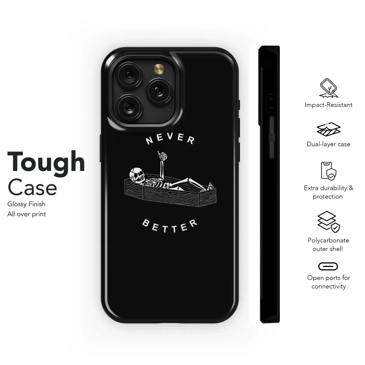 Never Better Skeleton Phone Case: Add some edgy humor to your everyday! Protect your iPhone, Samsung, or Pixel with this unique, eye-catching design. Perfect for those who appreciate a little bit of dark humor. Get yours now!
