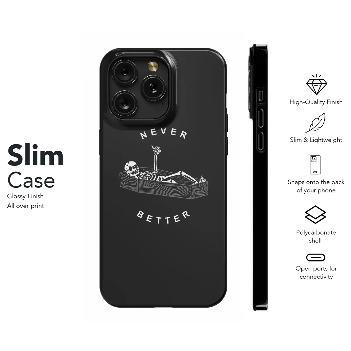 Never Better Skeleton Phone Case: Add some edgy humor to your everyday! Protect your iPhone, Samsung, or Pixel with this unique, eye-catching design. Perfect for those who appreciate a little bit of dark humor. Get yours now!
