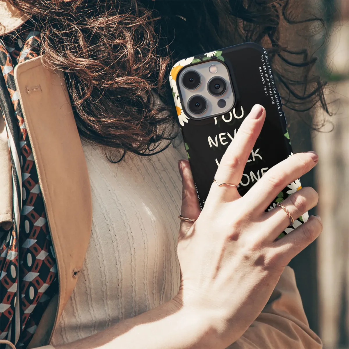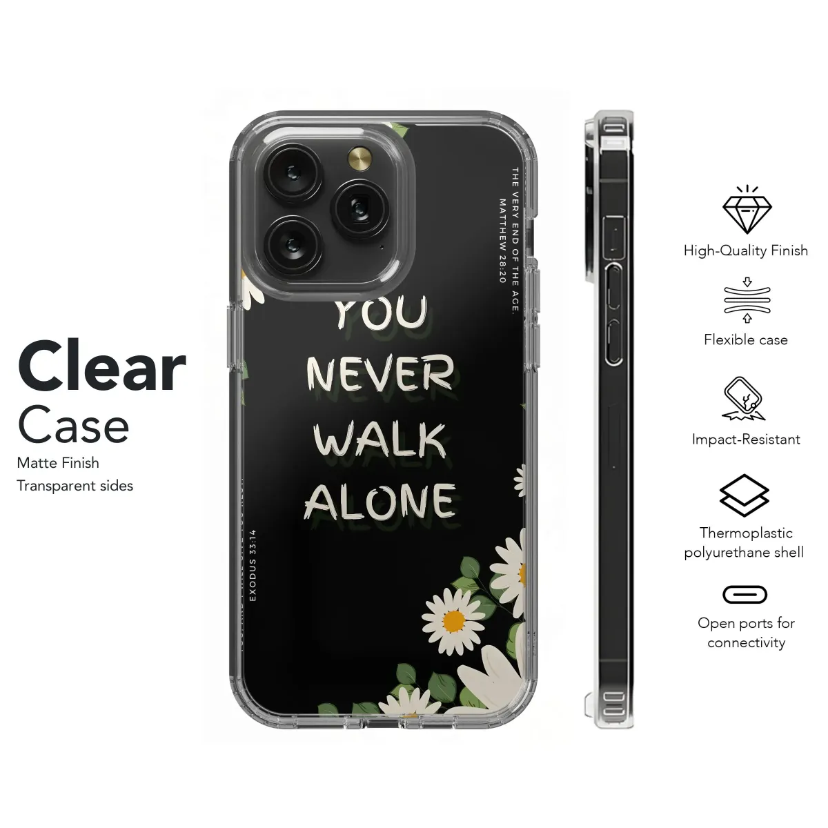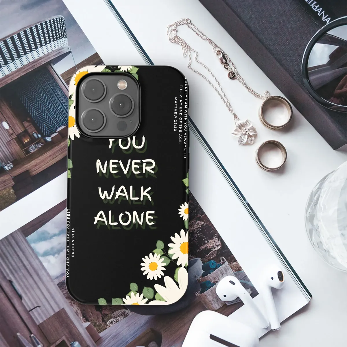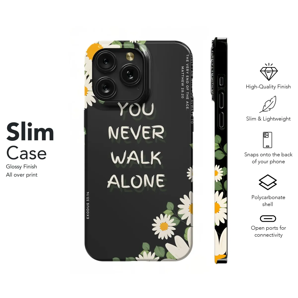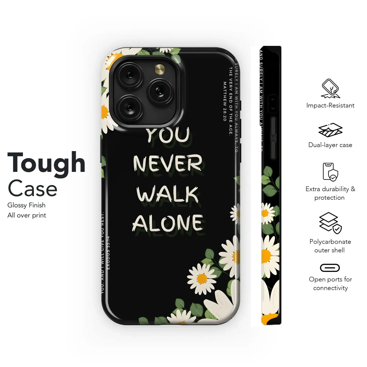 Adorn your everyday tech with this inspirational design! Featuring a beautiful arrangement of daisies against a striking black backdrop, this floral design is more than just aesthetically pleasing - it's a daily reminder of faith and hope. The powerful message "You Never Walk Alone" is prominently displayed, complemented by scripture verses from Matthew and Exodus, offering comfort and reassurance. Perfect for those seeking Christian gifts or inspirational art, this botanical-themed accessory provides a unique way to express your beliefs. The bright yellow centers of the daisies bring a touch of sunshine, even on the cloudiest days. This digital print is perfect for customizing your tech with a touch of elegance and spiritual encouragement. Let this lovely artwork become a daily affirmation of your unwavering faith. Explore Christian Decor, Spiritual Gifts, and Faith-Based Art today.