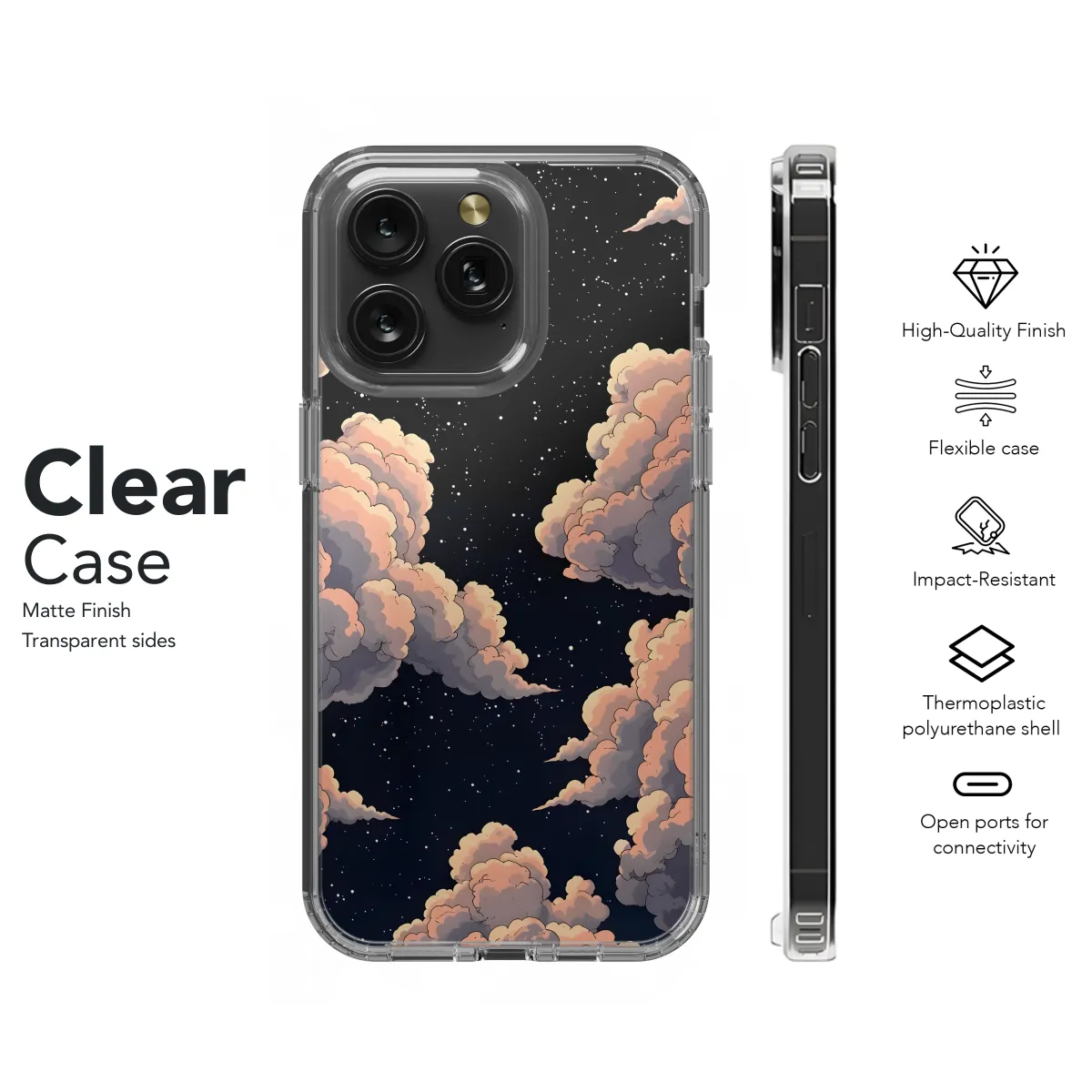 Immerse yourself in the celestial beauty of our Night Cloudscape Dream Phone Case. This enchanting accessory transforms your device into a canvas for ethereal dreamscapes. Let the swirling clouds and twinkling stars guide your imagination, transporting you to a realm of serenity and wonder.