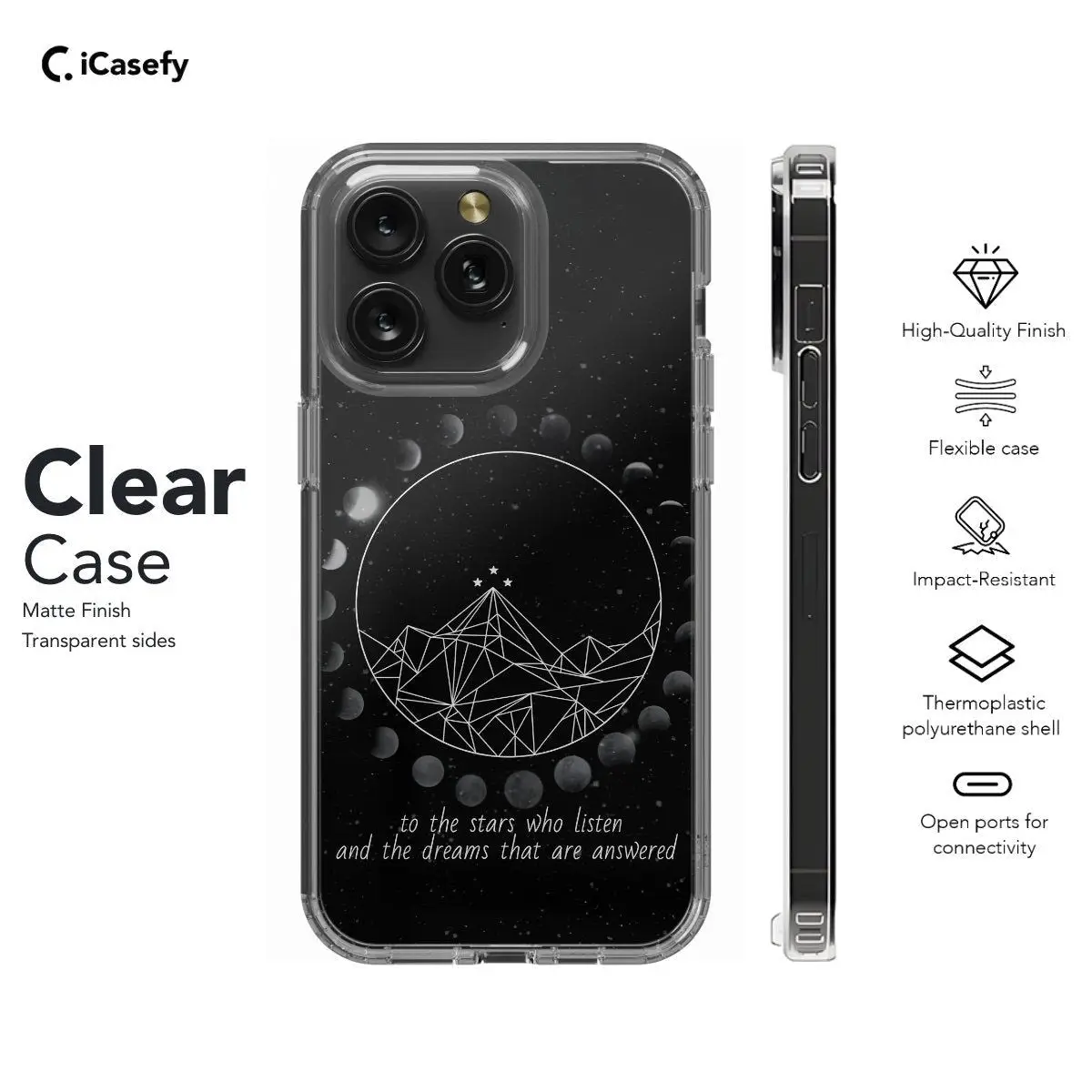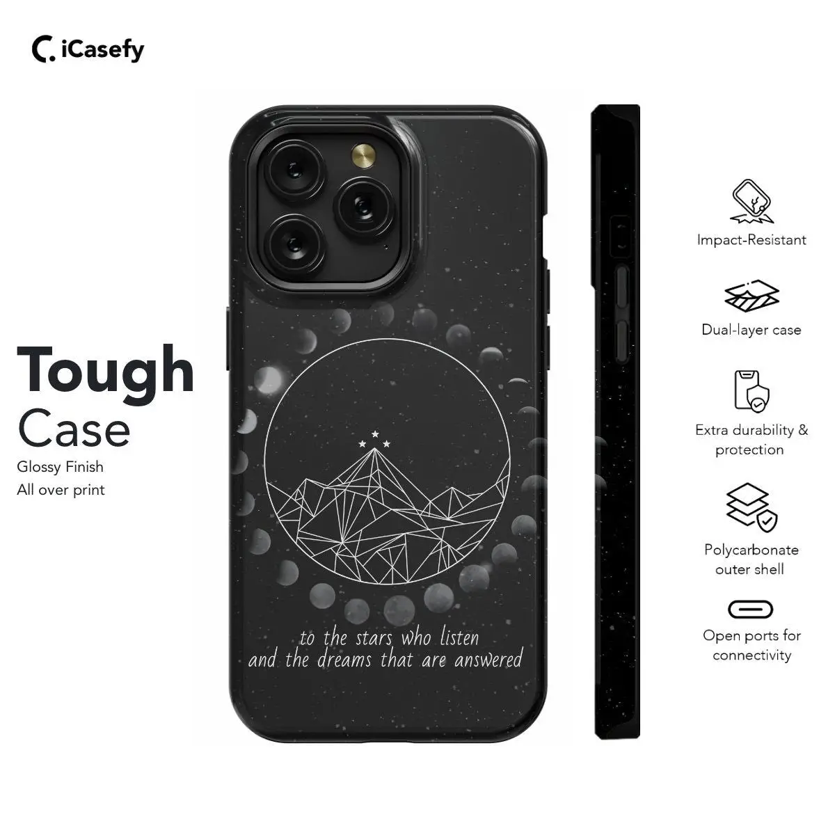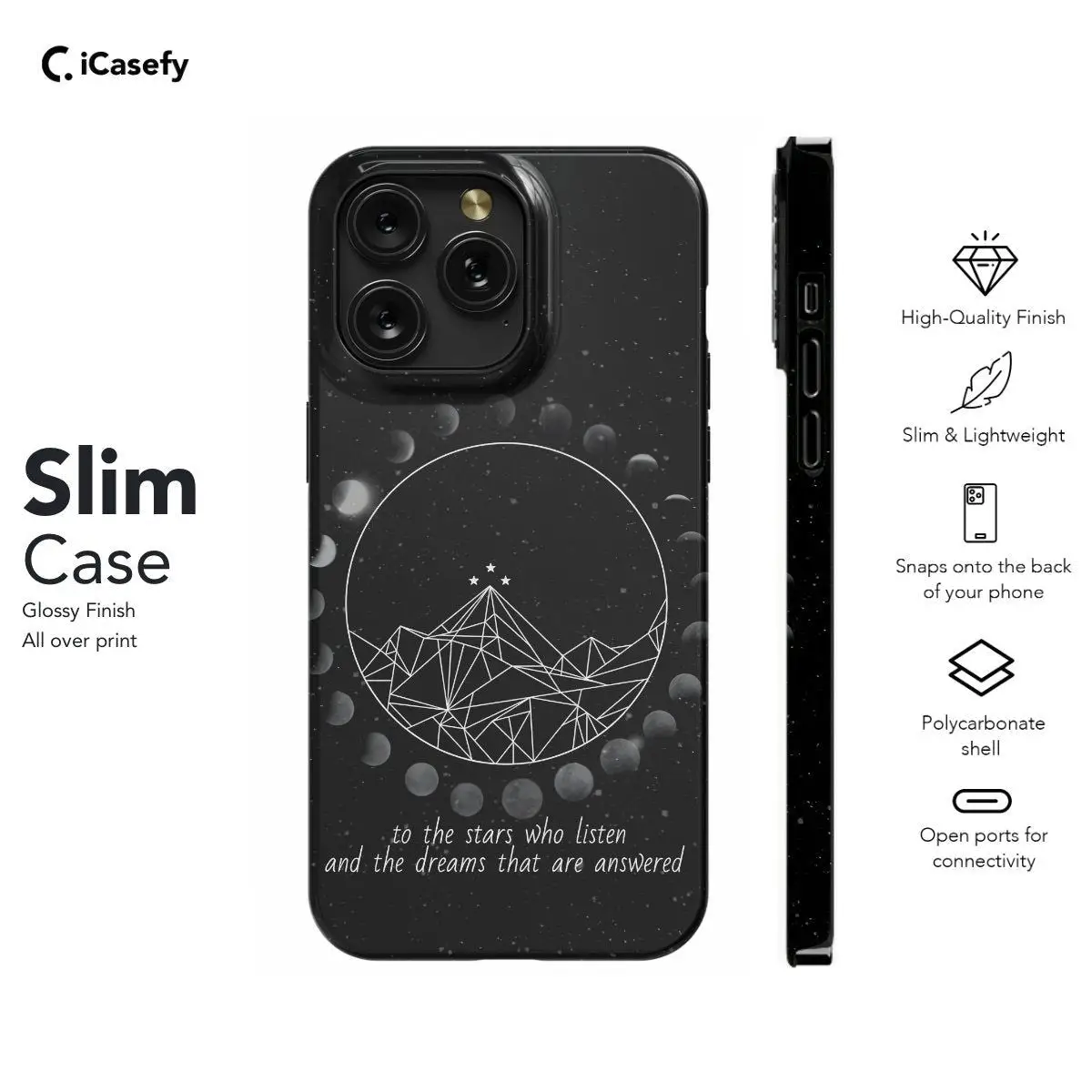 Immerse yourself in the enchanting realm of the Night Court with this captivating phone case featuring symbols from the ACOTAR series, including the Velaris mountain silhouette and celestial stars. This accessory pays homage to the mystical allure of Sarah J. Maas's beloved fantasy realm. Carry a piece of Prythian's magic with you wherever you go, and let your device become a reminder of the power and beauty of dreams with this enchanting case.