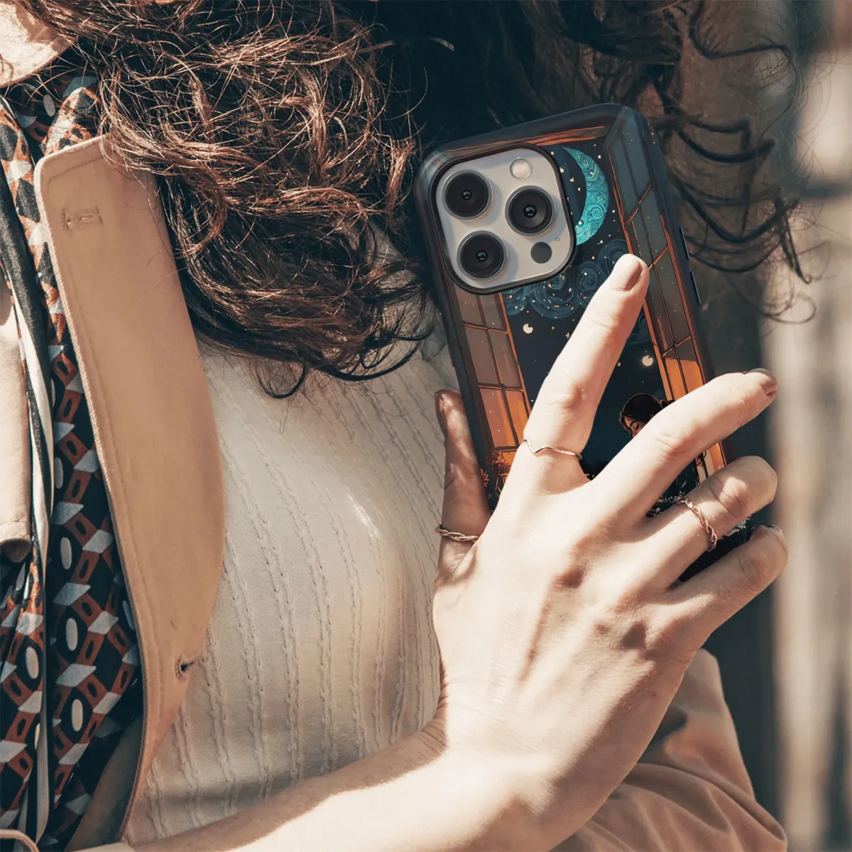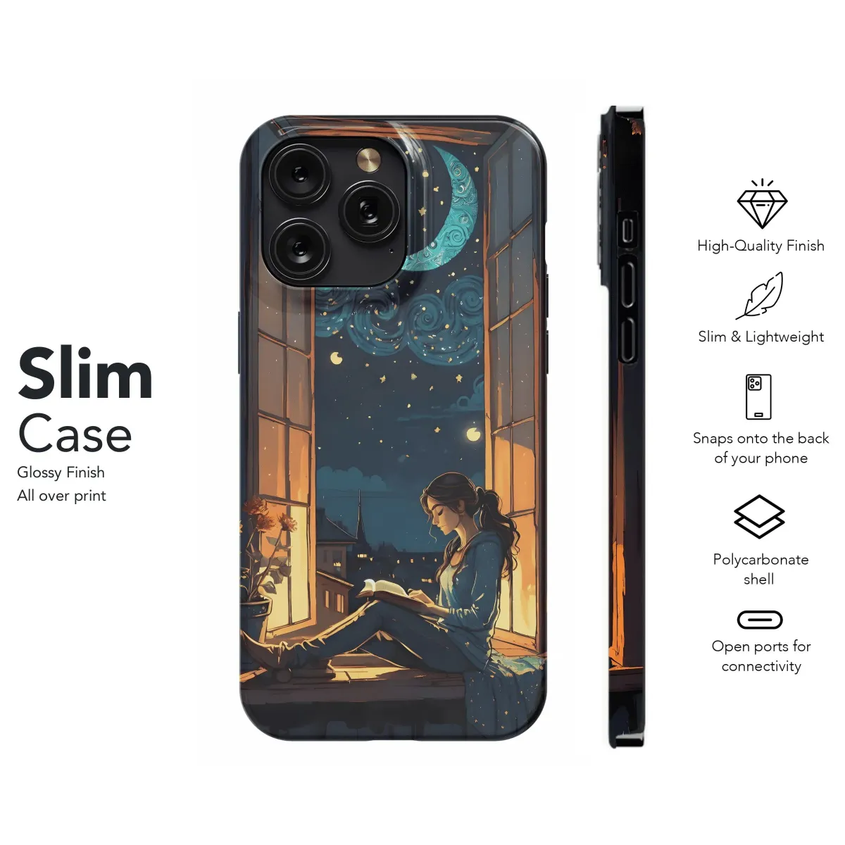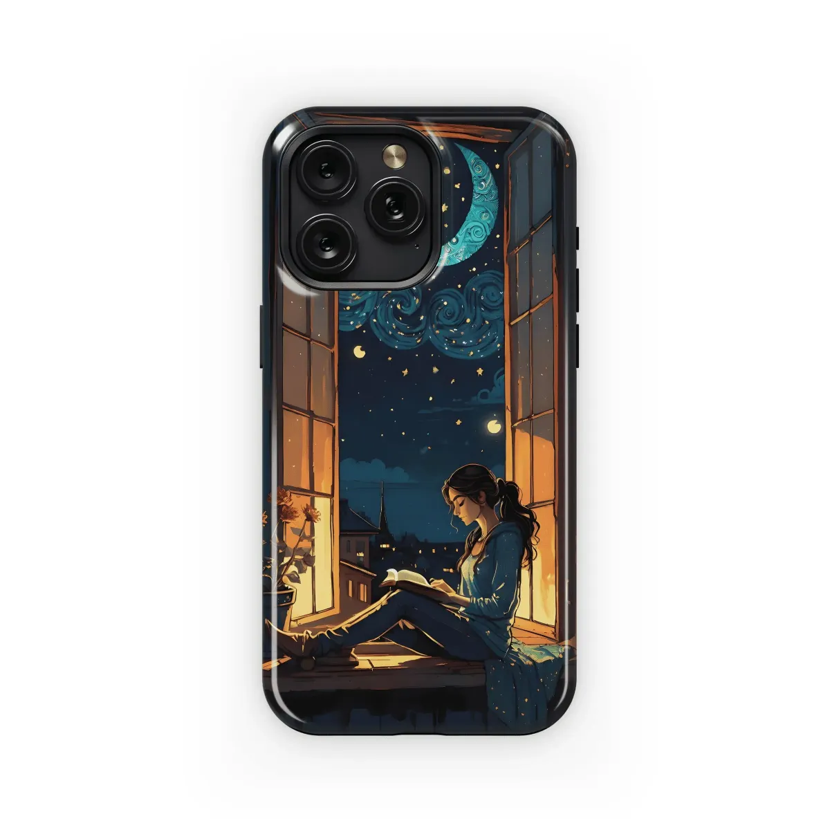 Evoke peaceful nights with this "Night Reading Moonlit Window" phone case. Protect your iPhone, Samsung, or Pixel (4/5/9/4) with a dreamy scene.
