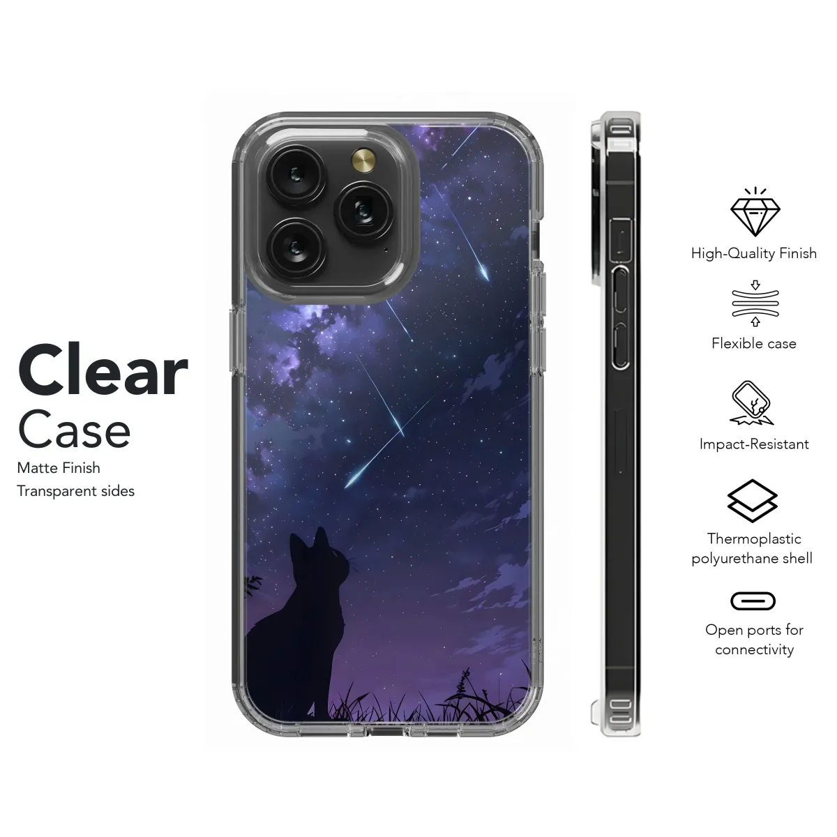 Protect your phone with this stunning "Night Sky Cat" case! Featuring a captivating celestial design, this cover fits iPhones, Samsung phones, and Pixel models (4767). A purrfect blend of style and protection.
