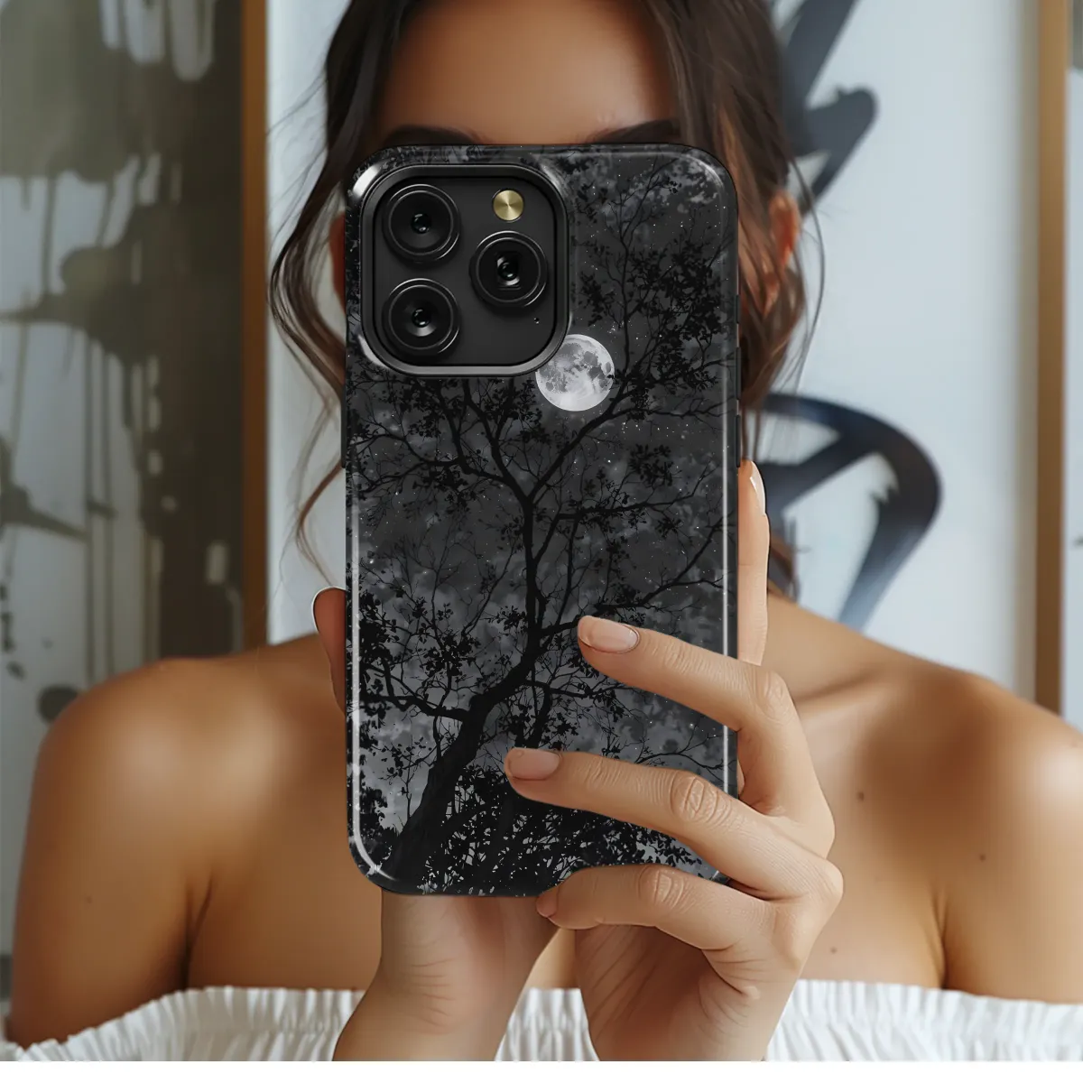 Embrace the enchanting allure of the night with this captivating design. A majestic tree stands silhouetted against a breathtaking backdrop of a luminous full moon and a star-studded sky. The intricate details of the branches and the ethereal glow of the celestial bodies create a mesmerizing scene, perfect for adding a touch of mystery and wonder to your everyday life. This high-quality print is vibrant and long-lasting, ensuring your design remains stunning for years to come. The grayscale palette offers a sophisticated and timeless aesthetic, making it a versatile accessory that complements various styles. Transform your accessory into a personal statement of artistic expression and nocturnal beauty. This design is a perfect gift for those who appreciate the beauty of the night sky and the captivating power of nature's artistry. Add a touch of elegance and mystery to your personal style with this unique and enchanting design, ready to adorn and protect your device. Its timeless appeal transcends trends, ensuring it remains a cherished item for years to come. Express your individual style with this captivating piece and showcase your appreciation for nature's subtle brilliance.