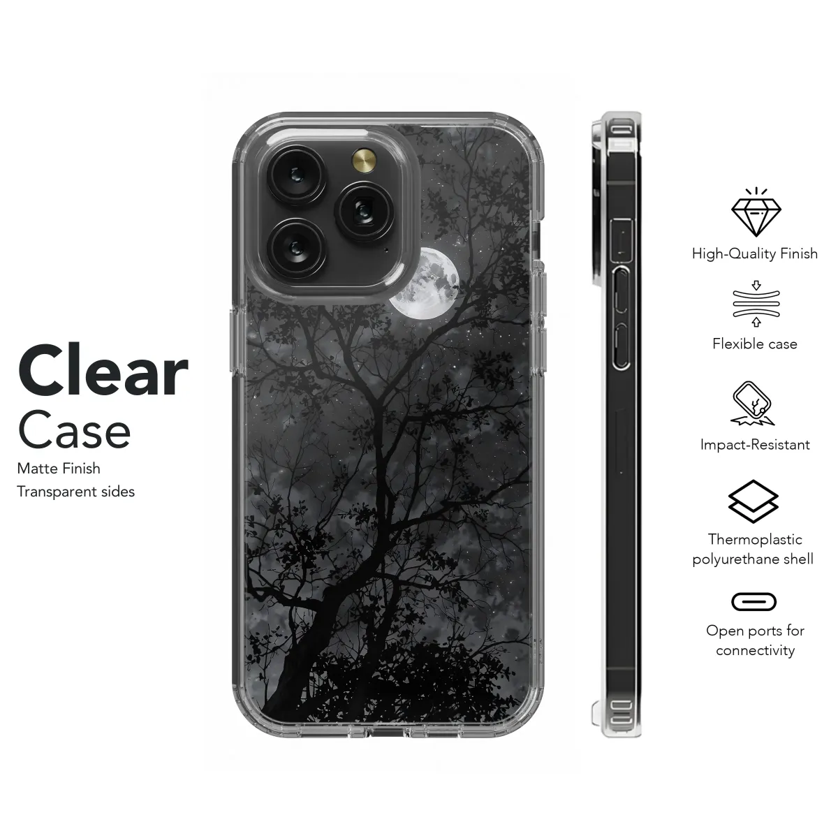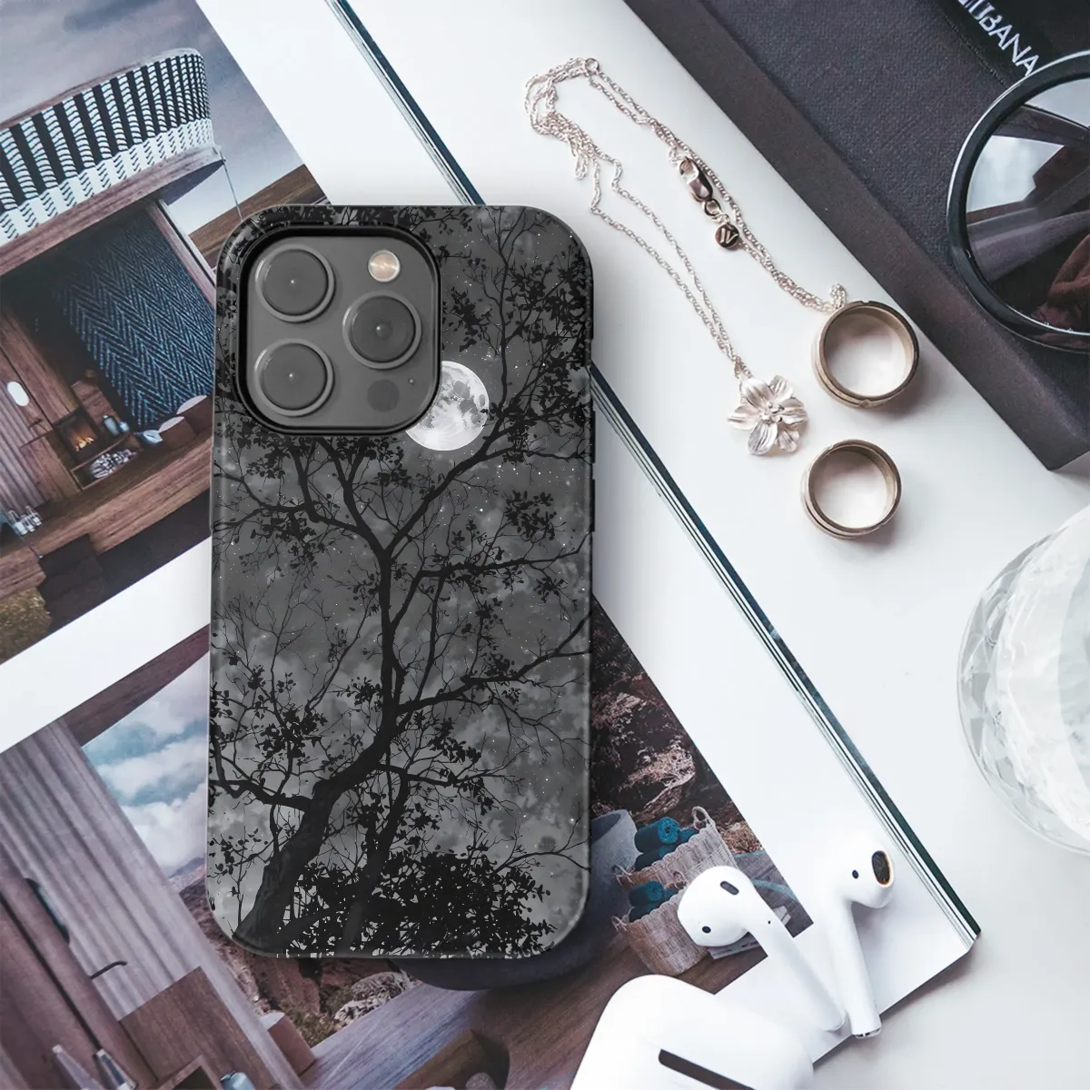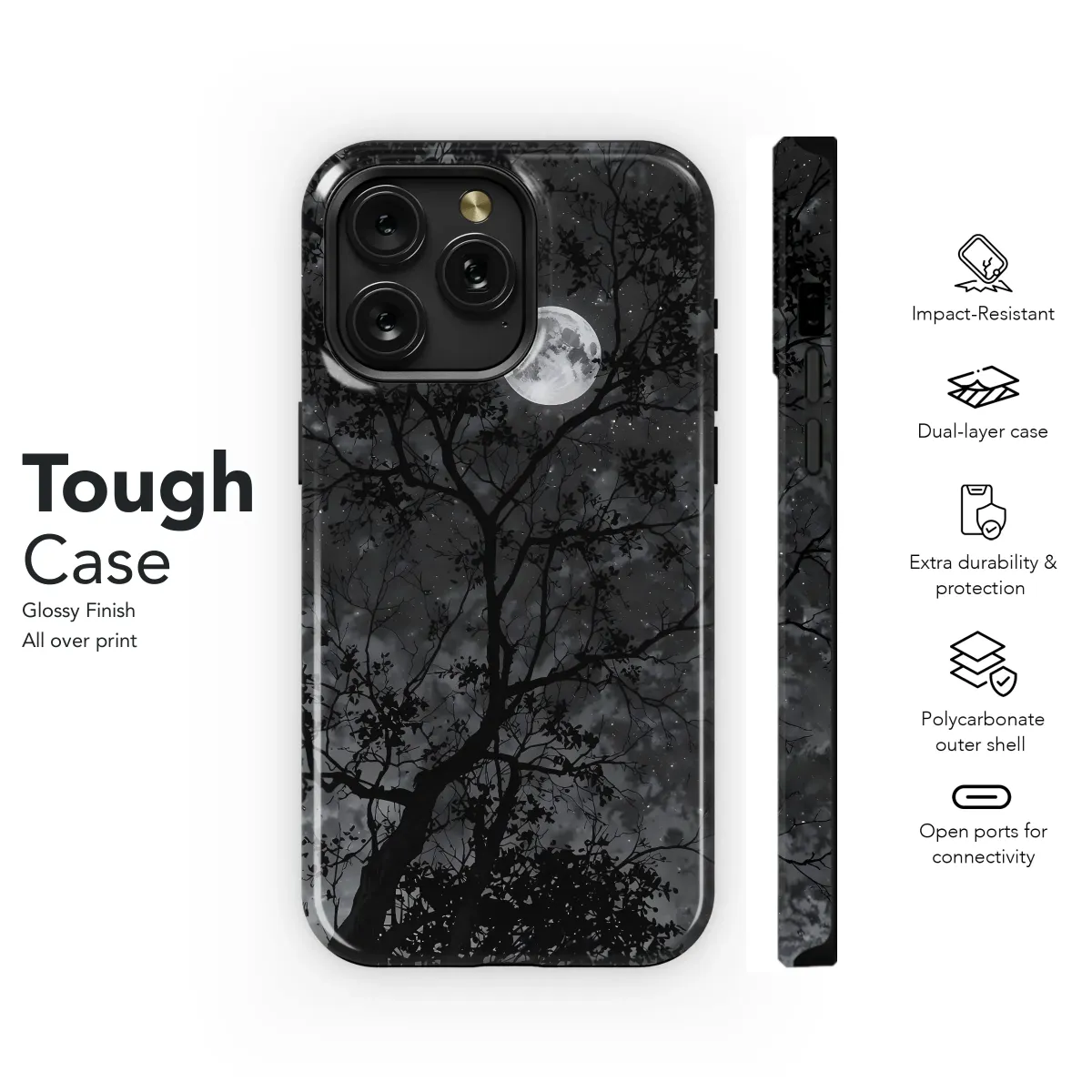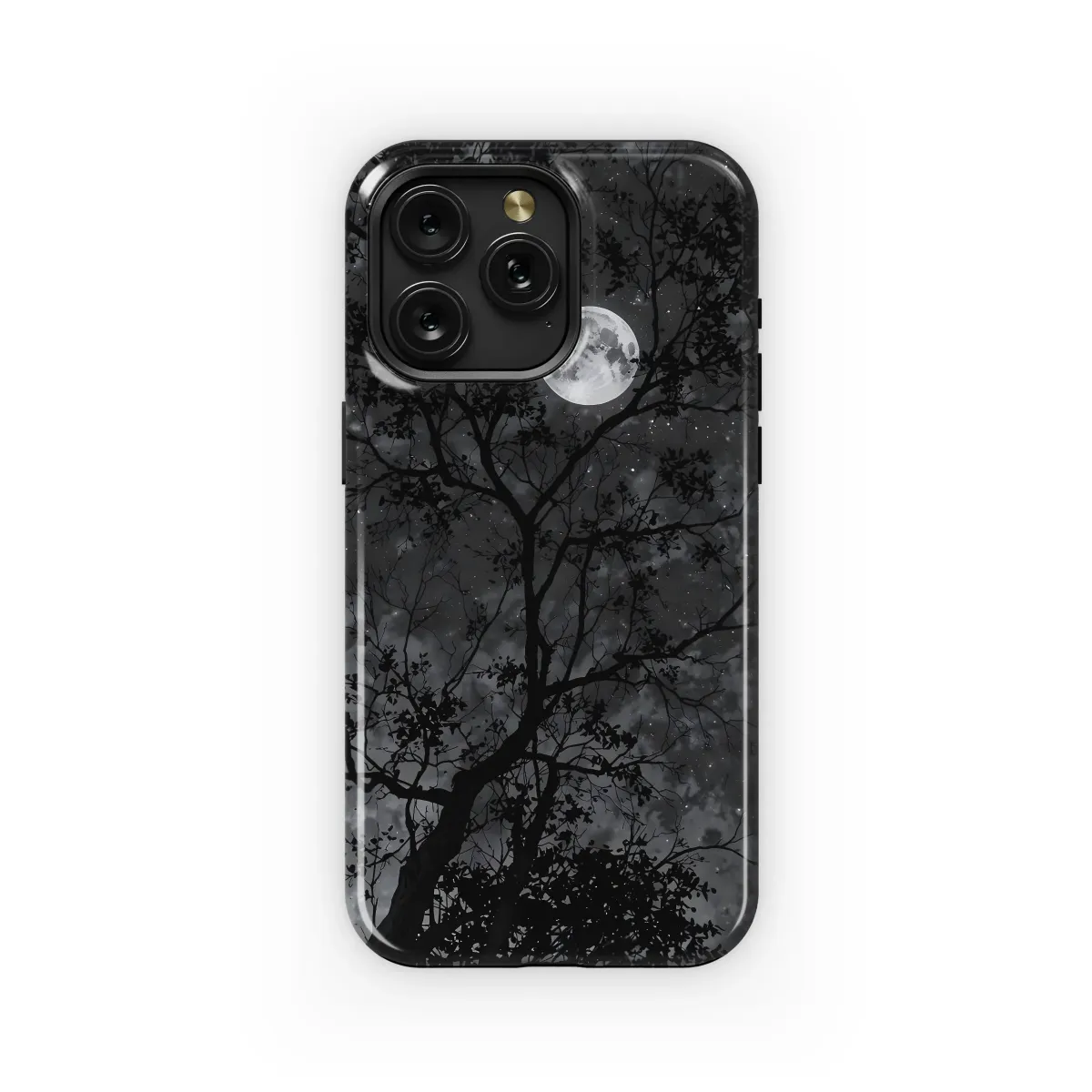 Embrace the enchanting allure of the night with this captivating design. A majestic tree stands silhouetted against a breathtaking backdrop of a luminous full moon and a star-studded sky. The intricate details of the branches and the ethereal glow of the celestial bodies create a mesmerizing scene, perfect for adding a touch of mystery and wonder to your everyday life. This high-quality print is vibrant and long-lasting, ensuring your design remains stunning for years to come. The grayscale palette offers a sophisticated and timeless aesthetic, making it a versatile accessory that complements various styles. Transform your accessory into a personal statement of artistic expression and nocturnal beauty. This design is a perfect gift for those who appreciate the beauty of the night sky and the captivating power of nature's artistry. Add a touch of elegance and mystery to your personal style with this unique and enchanting design, ready to adorn and protect your device. Its timeless appeal transcends trends, ensuring it remains a cherished item for years to come. Express your individual style with this captivating piece and showcase your appreciation for nature's subtle brilliance.