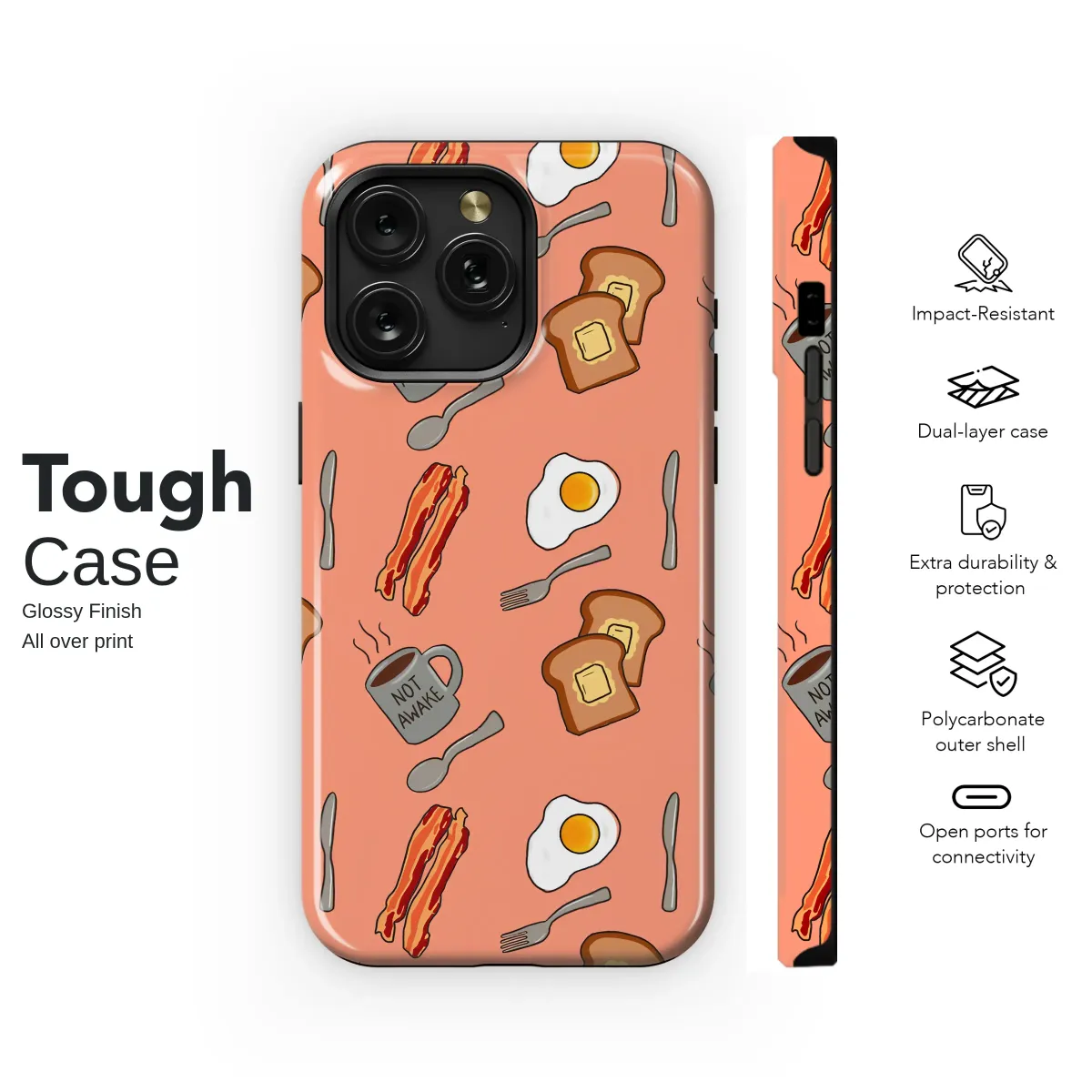 Start your day with a smile, or at least the promise of one, with this charming and relatable breakfast-themed design. Scattered across a warm, cheerful salmon pink canvas, this delightful pattern captures the sacred ritual of the morning meal in a whimsical, hand-drawn style. Imagine the delicious sizzle of crispy bacon, the perfect sunny-side-up egg, and golden-brown toast topped with a melting pat of butter, all rendered in a cute doodle aesthetic. At the heart of it all is the true hero of every morning: a steaming gray mug of coffee, humorously declaring 'NOT AWAKE' for all to see. This fun, illustrated artwork is a perfect tribute to all the late risers, coffee lovers, and anyone who needs a little fuel to get going. The unique, artistic flair makes it a wonderful conversation starter and a standout accessory for any foodie or brunch aficionado. Whether you're a breakfast champion or someone who simply appreciates a good laugh, this design wraps your daily essential in pure personality and joy. It's the perfect quirky gift for the brunch enthusiast in your life, a best friend, or a sweet treat to brighten your own daily routine. Celebrate the simple, cozy joy found in a perfectly made breakfast and that first, life-giving cup of coffee with this unforgettable piece.
