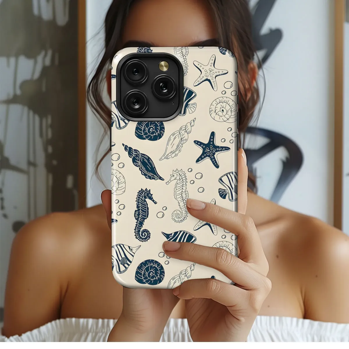 Dive into summer vibes with this captivating nautical pattern! This design features a delightful collection of hand-drawn style sea creatures, including majestic seahorses, charming starfish, pretty shells, and whimsical striped fish, all floating amongst tiny bubbles. The serene cream background accentuates the cool, contrasting navy ink, creating a classic and timeless aesthetic that's both playful and sophisticated. Perfect for adding a touch of coastal charm to your everyday essentials, this artwork evokes the feeling of a relaxing day at the beach. Get your hands on this unique and trendy design perfect for seaside lovers! Use this charming ocean print to infuse a marine ambiance to your accessories. This is a must-have for beachy aesthetic, nautical decor, sea life enthusiasts. Great for phone skins.