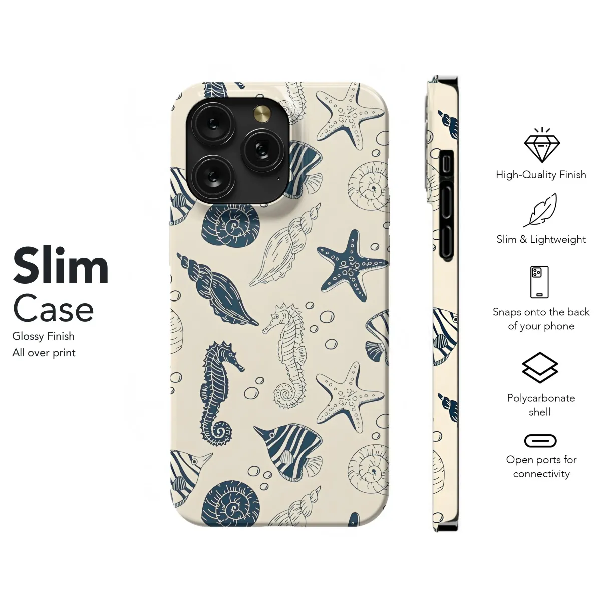 Dive into summer vibes with this captivating nautical pattern! This design features a delightful collection of hand-drawn style sea creatures, including majestic seahorses, charming starfish, pretty shells, and whimsical striped fish, all floating amongst tiny bubbles. The serene cream background accentuates the cool, contrasting navy ink, creating a classic and timeless aesthetic that's both playful and sophisticated. Perfect for adding a touch of coastal charm to your everyday essentials, this artwork evokes the feeling of a relaxing day at the beach. Get your hands on this unique and trendy design perfect for seaside lovers! Use this charming ocean print to infuse a marine ambiance to your accessories. This is a must-have for beachy aesthetic, nautical decor, sea life enthusiasts. Great for phone skins.