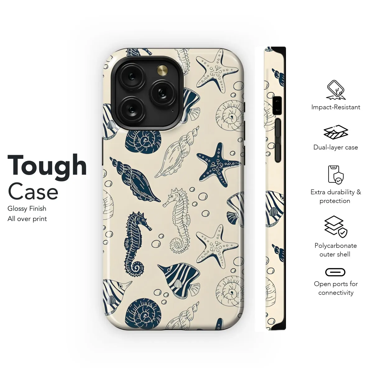 Dive into summer vibes with this captivating nautical pattern! This design features a delightful collection of hand-drawn style sea creatures, including majestic seahorses, charming starfish, pretty shells, and whimsical striped fish, all floating amongst tiny bubbles. The serene cream background accentuates the cool, contrasting navy ink, creating a classic and timeless aesthetic that's both playful and sophisticated. Perfect for adding a touch of coastal charm to your everyday essentials, this artwork evokes the feeling of a relaxing day at the beach. Get your hands on this unique and trendy design perfect for seaside lovers! Use this charming ocean print to infuse a marine ambiance to your accessories. This is a must-have for beachy aesthetic, nautical decor, sea life enthusiasts. Great for phone skins.