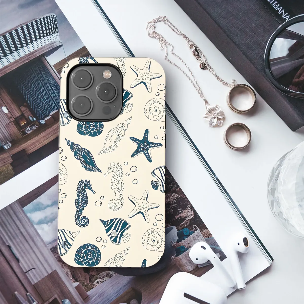 Dive into summer vibes with this captivating nautical pattern! This design features a delightful collection of hand-drawn style sea creatures, including majestic seahorses, charming starfish, pretty shells, and whimsical striped fish, all floating amongst tiny bubbles. The serene cream background accentuates the cool, contrasting navy ink, creating a classic and timeless aesthetic that's both playful and sophisticated. Perfect for adding a touch of coastal charm to your everyday essentials, this artwork evokes the feeling of a relaxing day at the beach. Get your hands on this unique and trendy design perfect for seaside lovers! Use this charming ocean print to infuse a marine ambiance to your accessories. This is a must-have for beachy aesthetic, nautical decor, sea life enthusiasts. Great for phone skins.