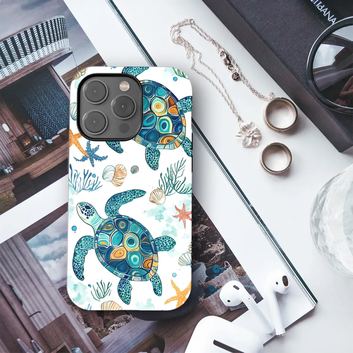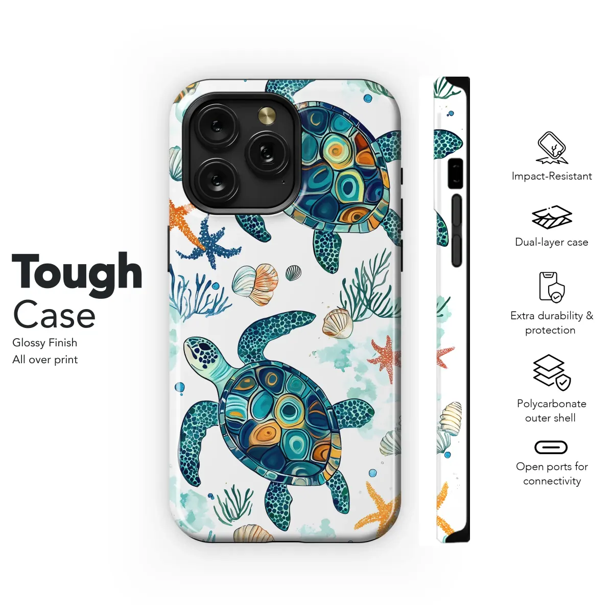 Dive into summer with this vibrant, hand-drawn design featuring two majestic sea turtles gracefully swimming amidst a coral reef. Intricate details and a captivating color palette of teal, orange, and gold bring these ocean dwellers to life. Surrounding them are starfish, seashells, and swaying sea plants, creating a serene underwater scene perfect for adding a touch of coastal charm to your personal style. This beautiful artwork is professionally printed using high-quality inks to ensure vibrant, long-lasting colors. It's lightweight yet durable, providing optimal protection and showcasing your unique taste. The design's detailed rendering and whimsical style create a delightful accessory, perfect for adding a splash of ocean-inspired beauty to your everyday life. Express your love for marine life and summer's carefree spirit with this stunning piece; a perfect gift for yourself or a fellow ocean enthusiast. This unique design offers a fresh take on aquatic artistry, guaranteed to turn heads. Its high-resolution printing ensures the intricate details and bright colors will stand out and make a statement. Embrace the ocean's tranquility with this stylish and captivating accessory.