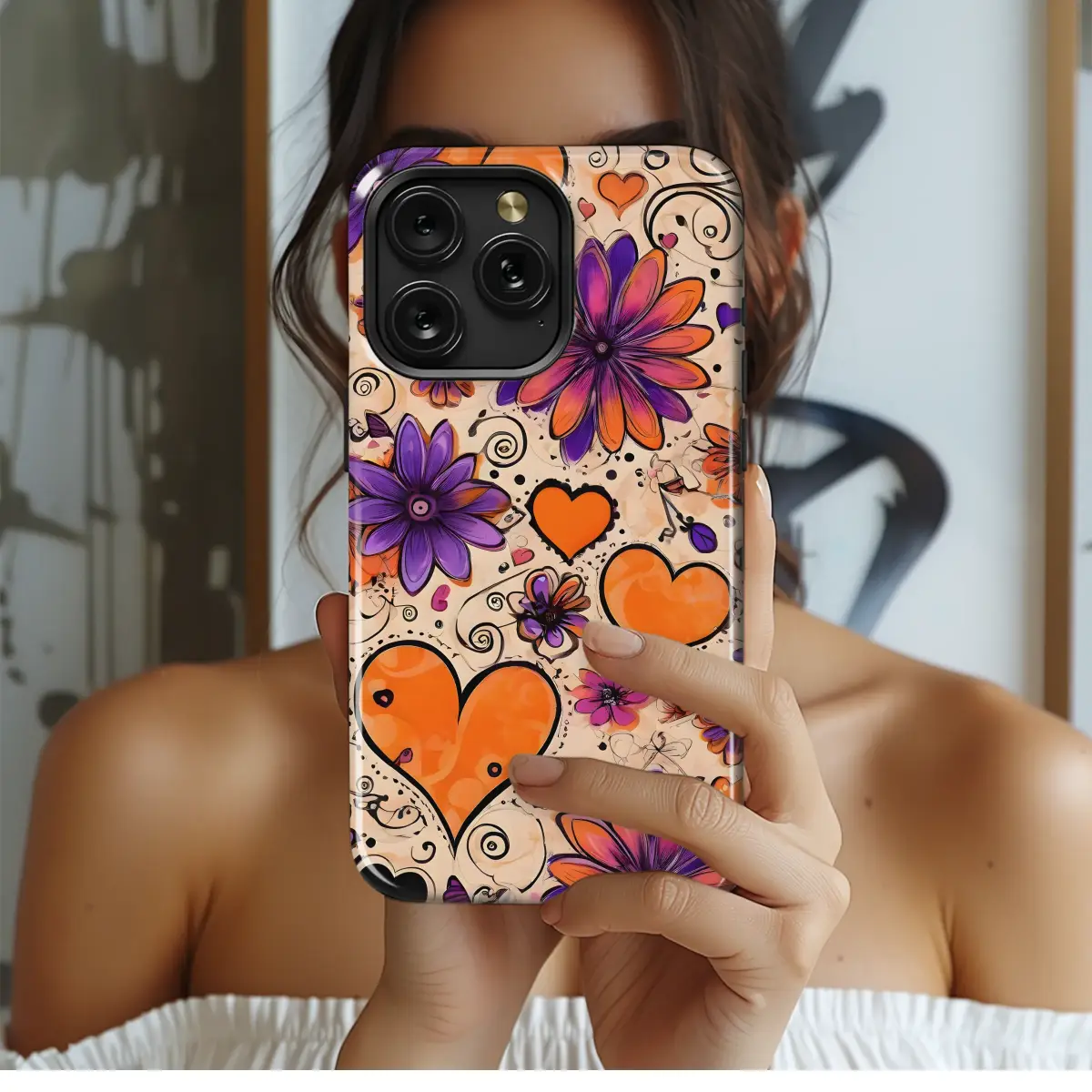 Embrace vibrant romance with this artistic design, featuring a captivating blend of bold orange hearts and rich purple flowers. The playful swirls and whimsical details create a cheerful, energetic aesthetic perfect for adding a pop of personality to your everyday essentials. This eye-catching artwork showcases a unique style, combining hand-drawn elements with digital artistry for a modern, hand-crafted feel. The striking color palette of sunny oranges and deep purples is both sophisticated and fun, making it a statement piece that's as individual as you are. This design is printed using high-quality inks for long-lasting vibrancy and durability, ensuring your new accessory remains a favorite for years to come. Express your unique style and let your creativity bloom with this gorgeous and expressive print, ideal for adding a touch of happy energy to your look. Perfect for gifting or treating yourself, this design makes a wonderful addition to any collection, offering a fresh and modern take on classic romantic imagery. Its energetic and playful feel makes it perfect for anyone looking to add a bold and beautiful touch to their life.