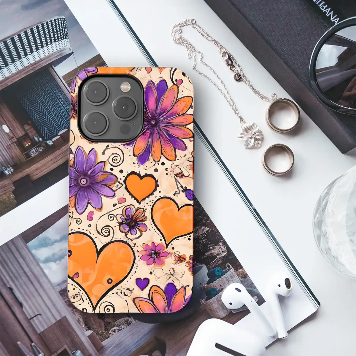 Embrace vibrant romance with this artistic design, featuring a captivating blend of bold orange hearts and rich purple flowers. The playful swirls and whimsical details create a cheerful, energetic aesthetic perfect for adding a pop of personality to your everyday essentials. This eye-catching artwork showcases a unique style, combining hand-drawn elements with digital artistry for a modern, hand-crafted feel. The striking color palette of sunny oranges and deep purples is both sophisticated and fun, making it a statement piece that's as individual as you are. This design is printed using high-quality inks for long-lasting vibrancy and durability, ensuring your new accessory remains a favorite for years to come. Express your unique style and let your creativity bloom with this gorgeous and expressive print, ideal for adding a touch of happy energy to your look. Perfect for gifting or treating yourself, this design makes a wonderful addition to any collection, offering a fresh and modern take on classic romantic imagery. Its energetic and playful feel makes it perfect for anyone looking to add a bold and beautiful touch to their life.