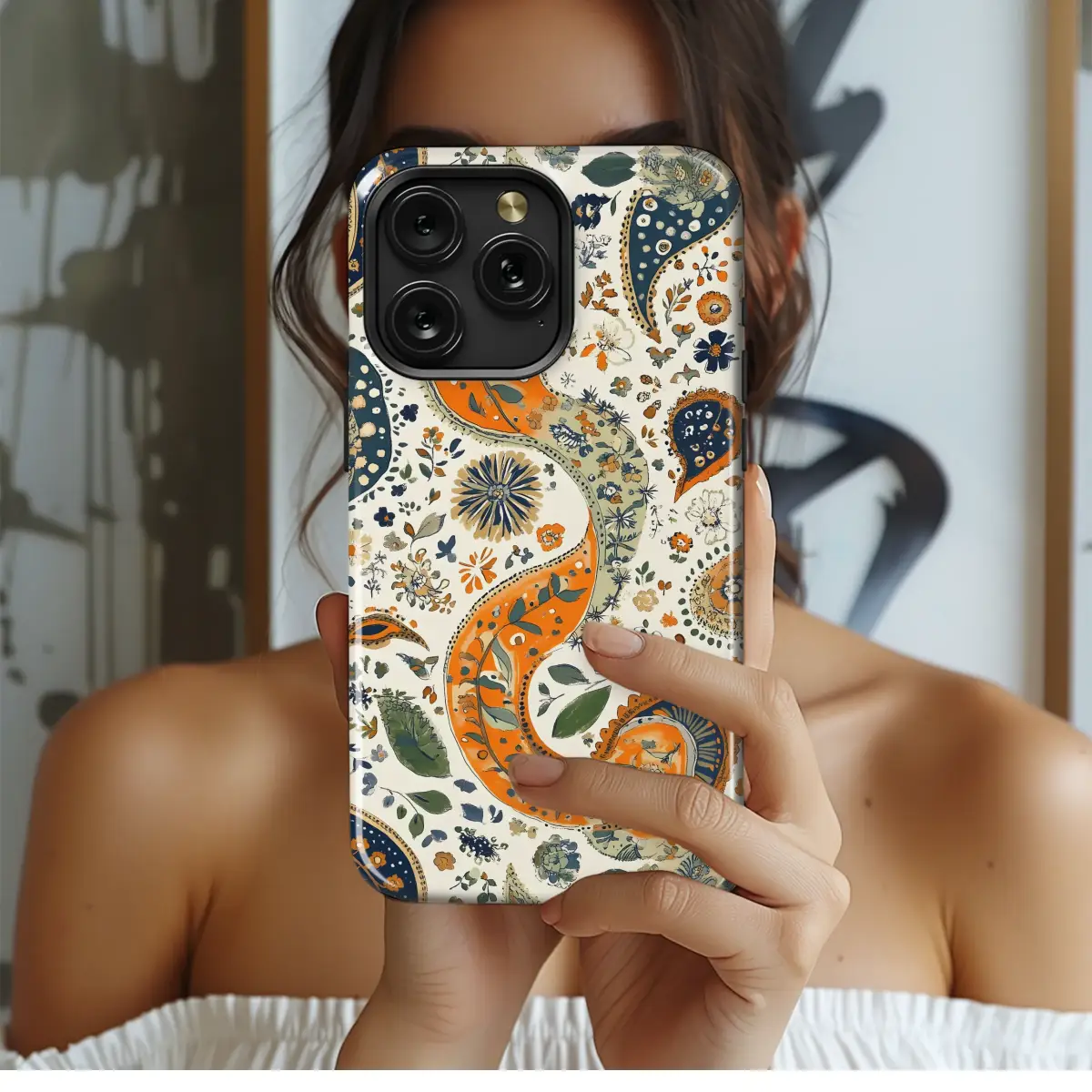Elevate your style with this exquisite paisley design, featuring a vibrant interplay of burnt orange, deep teal, and soft sage greens against a crisp white backdrop. Intricate floral details and swirling paisley patterns create a captivating bohemian aesthetic, perfect for adding a touch of vintage charm to your everyday essentials. This meticulously crafted artwork boasts a rich, textured appearance, offering a sophisticated and unique look that stands out from the crowd. The detailed botanical motifs and flowing lines exude an air of effortless elegance, making it a versatile choice for fashion-forward individuals. Its timeless appeal ensures it will remain a stylish statement for years to come. Embrace this stunning design and add a splash of artistic flair to your personal style. This high-quality print is sure to turn heads and become a treasured accessory. This design is perfect for showcasing your unique personality and adding a touch of artistic flair wherever you go. The intricate details and bold colors are sure to make a statement. Order yours today and experience the difference!
