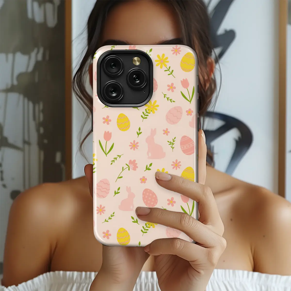 Celebrate the season with this cheerful Easter-themed pattern. The design features a charming arrangement of pink bunny silhouettes, colorfully decorated eggs in pastel pink and yellow, and a variety of delicate spring flowers. Set against a soft peach background, this whimsical illustration captures the joyful spirit of spring.