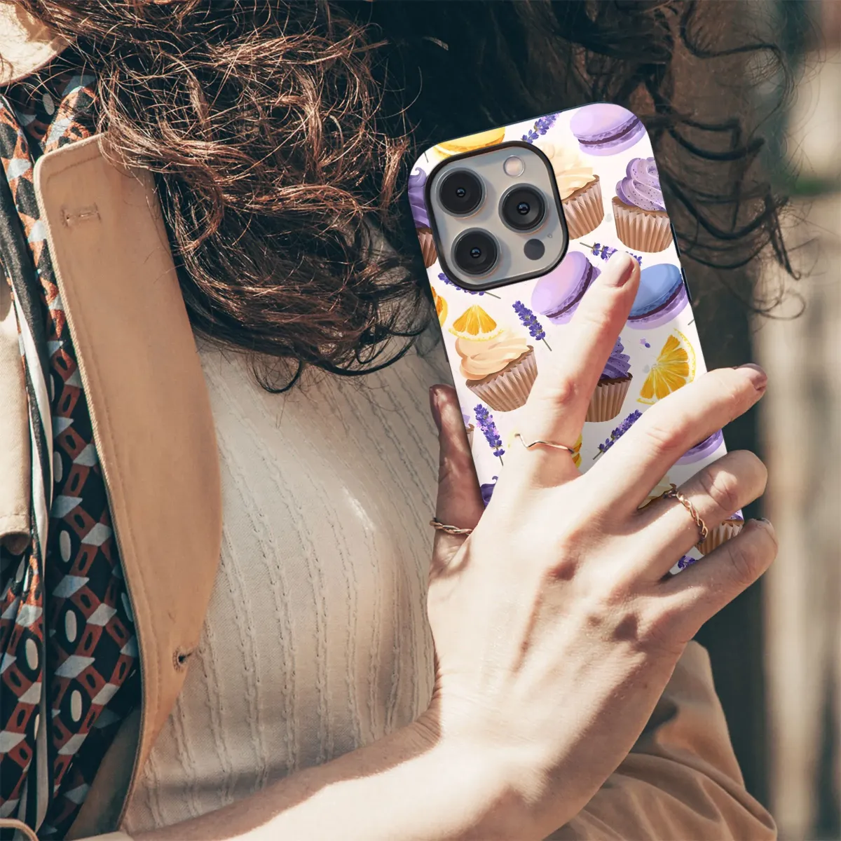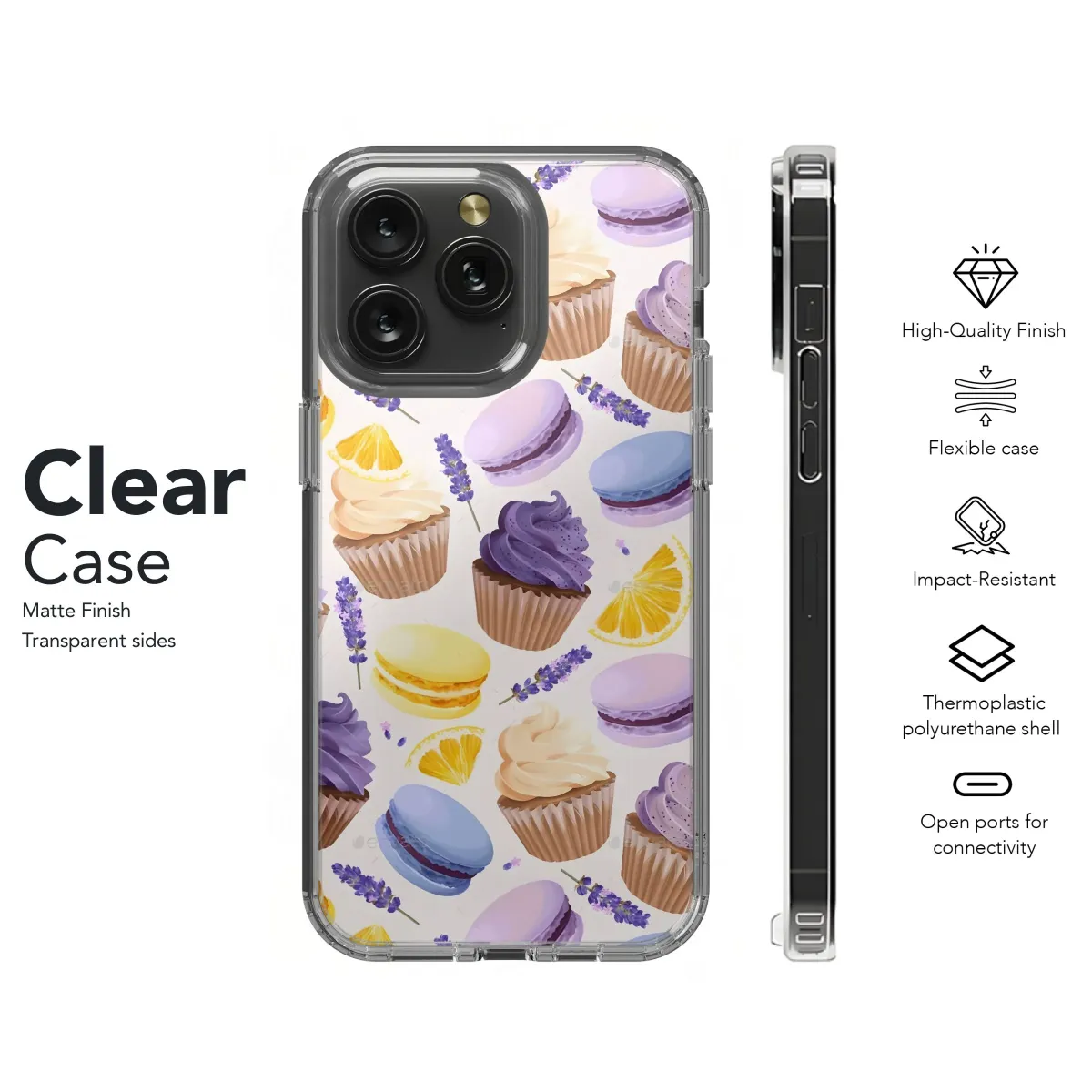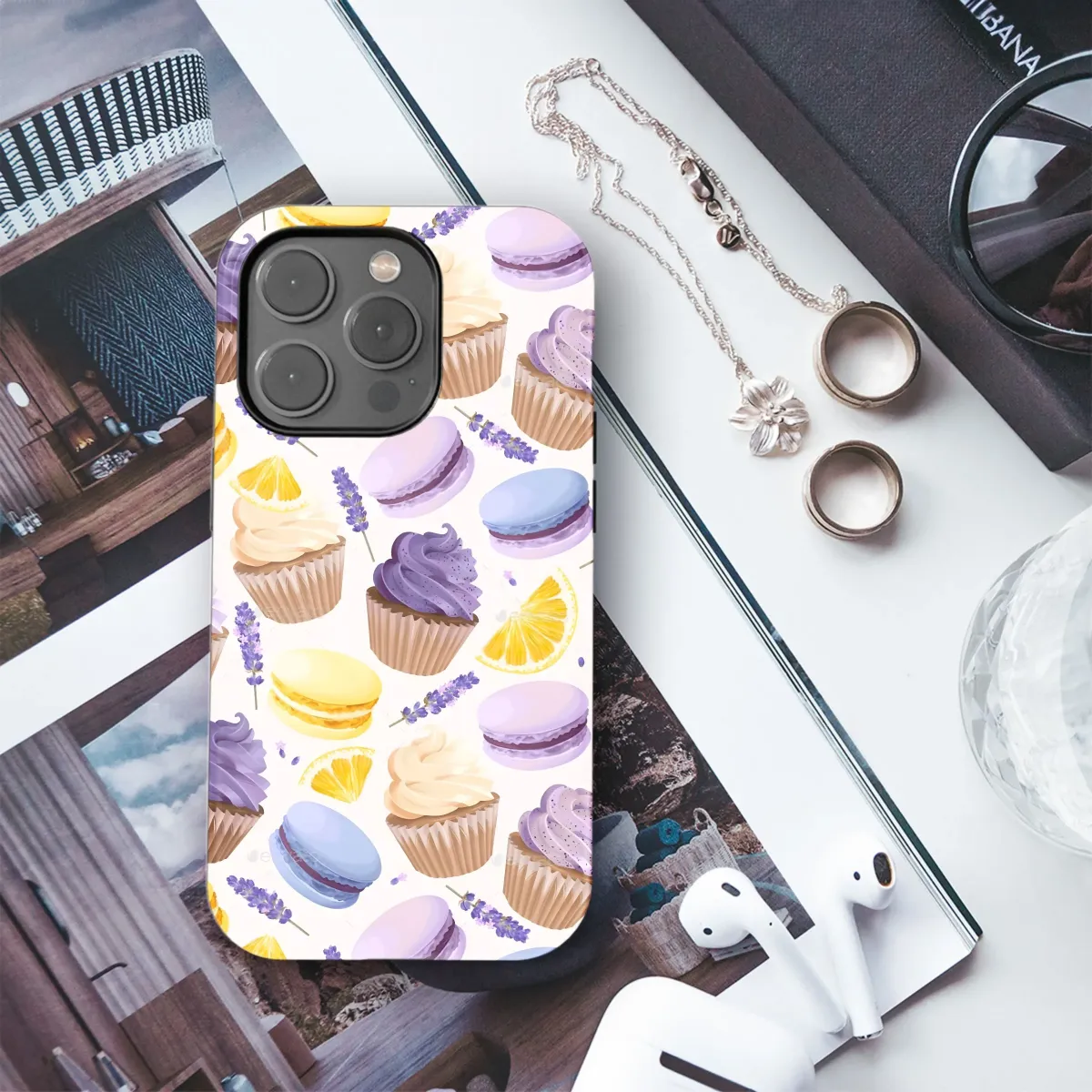 Capture the delightful essence of a sun-drenched afternoon tea with this charming pattern featuring an array of French patisserie favorites and garden-fresh accents. Delicate macarons in soft pastel shades of sunny yellow, sky blue, and lovely lilac are scattered alongside sweetly frosted cupcakes adorned with swirls of creamy vanilla and rich purple icing. Complementing these tempting treats are sprigs of fragrant lavender blossoms and bright, zesty lemon slices, adding a touch of botanical elegance and vibrant contrast. This whimsical illustration evokes feelings of sweetness, joy, and sophisticated indulgence, creating a truly enchanting visual experience. The intricate details and soft color palette make this design a truly unique statement piece, perfect for anyone who appreciates the art of baking, floral beauty, or simply the finer, sweeter things in life. Imagine this delightful print adding a pop of personality and charm to your most cherished belongings, making them stand out with a touch of sweet elegance and unique style. It’s an ideal design for a thoughtful gift for the baker, foodie, or anyone who loves cute, colorful, and chic patterns. Bring a little bit of Parisian charm and dessert heaven wherever you go with this exquisite and eye-catching artwork. Its cheerful and elegant composition is sure to brighten your day and draw admiring glances, offering a perpetual reminder of delicious moments and beautiful aesthetics. This pattern is crafted to infuse everyday objects with a sense of whimsical beauty and culinary delight, perfect for adding a personal touch to your daily routine.