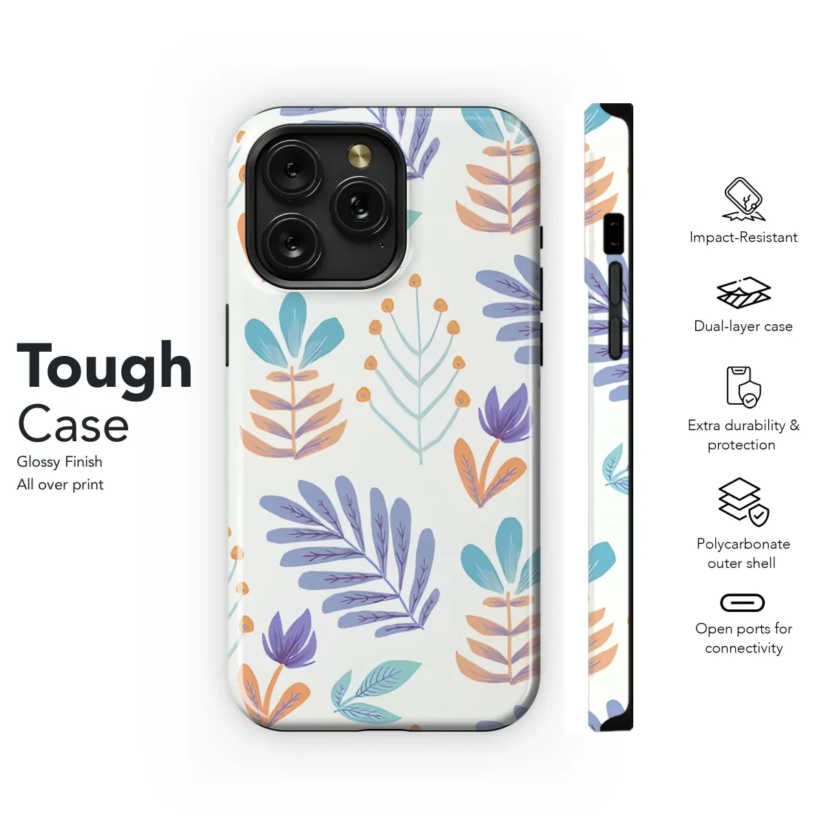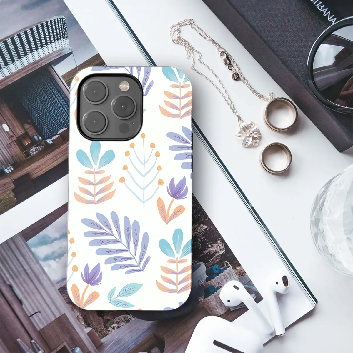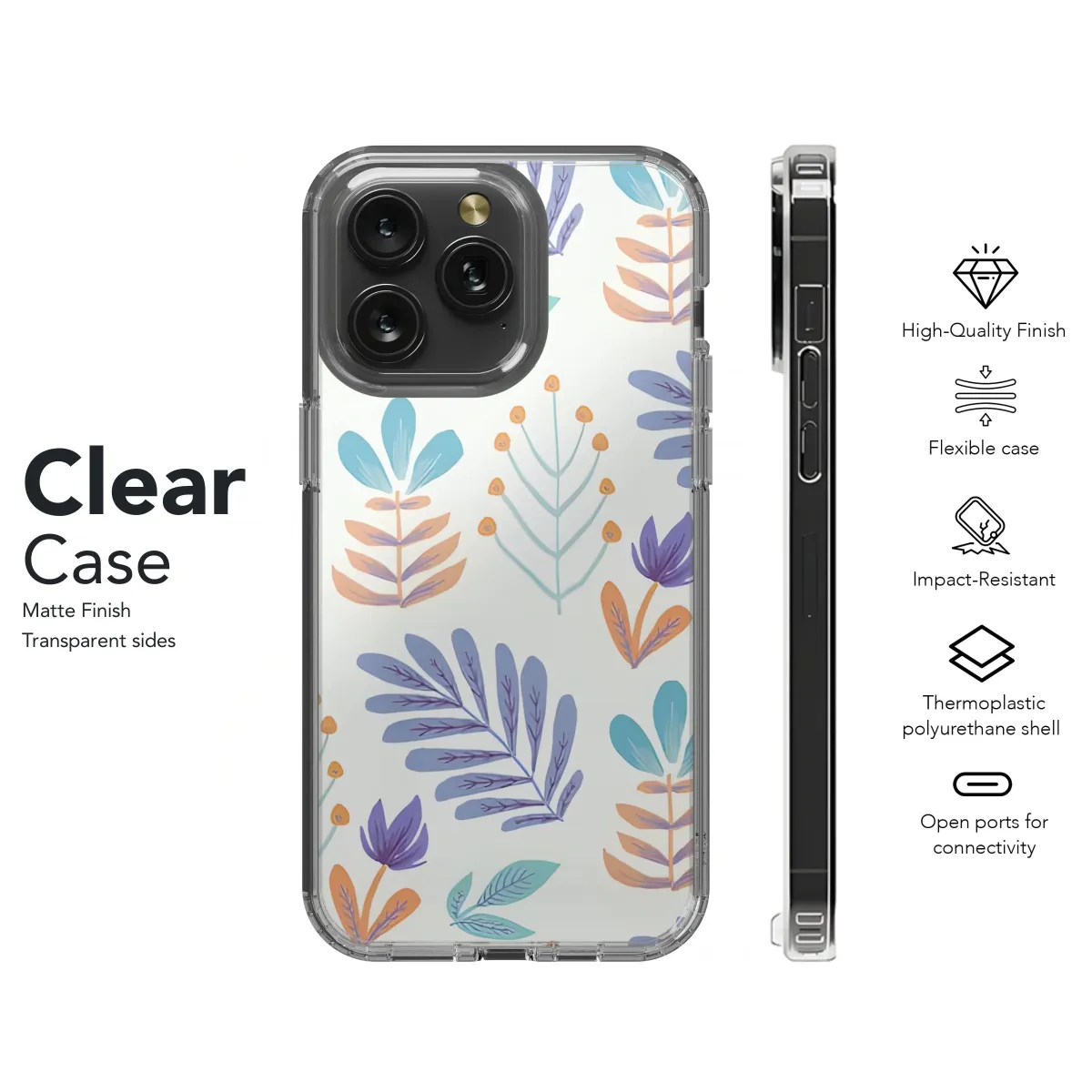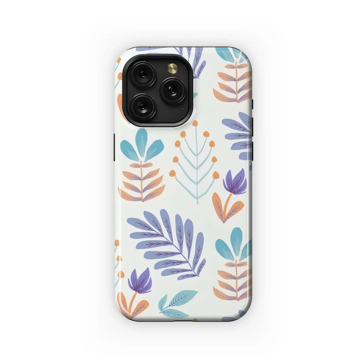 Discover the captivating charm of this exquisite botanical pattern, a delightful digital tapestry woven with nature's gentle touch and a touch of artistic whimsy. This unique artwork presents a harmonious arrangement of stylized floral and leafy motifs, rendered in a soft, inviting palette of serene lavender, vibrant teal, warm coral, and cool pale blue set against a crisp, serene white background. Each element possesses a distinct hand-drawn quality, imbuing the design with an organic, folk-art feel, reminiscent of a quiet spring garden or a sun-dappled meadow bursting with life. Large, graceful leaves in shades of periwinkle blue intermingle seamlessly with slender stems adorned with delicate blooms in soft violet hues and striking turquoise, while abstract botanical structures featuring warm orange berry-like clusters and cool greyish-blue sprigs add layers of visual interest and depth. This artistic print is perfect for adding a touch of personalized beauty and natural elegance to your most cherished everyday essentials. It effortlessly transforms ordinary objects into stylish statements, offering a unique and beautiful way to carry a piece of serene nature and artistic expression with you throughout your day. Embrace the charming artistry and intricate details of this stunning design, making it an ideal gift for nature lovers, art enthusiasts, or anyone who appreciates delicate patterns and a touch of whimsical botanical beauty. Enhance your personal style with this captivating floral print, a true celebration of natural forms depicted through a modern, delicate lens, bringing a sense of calm and joy to your accessories.
