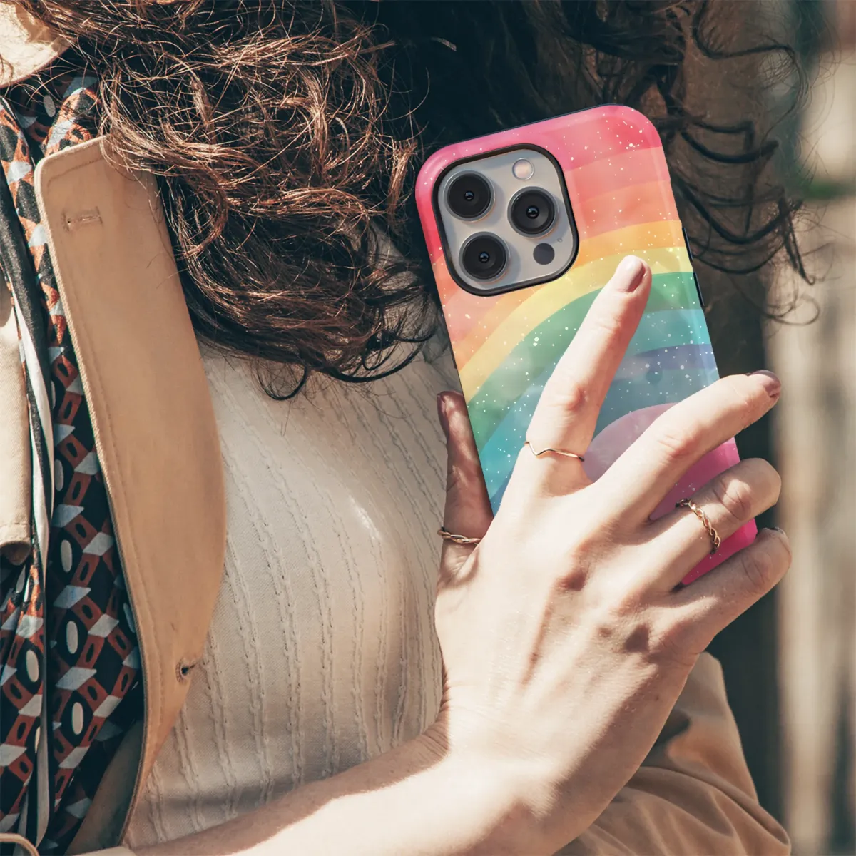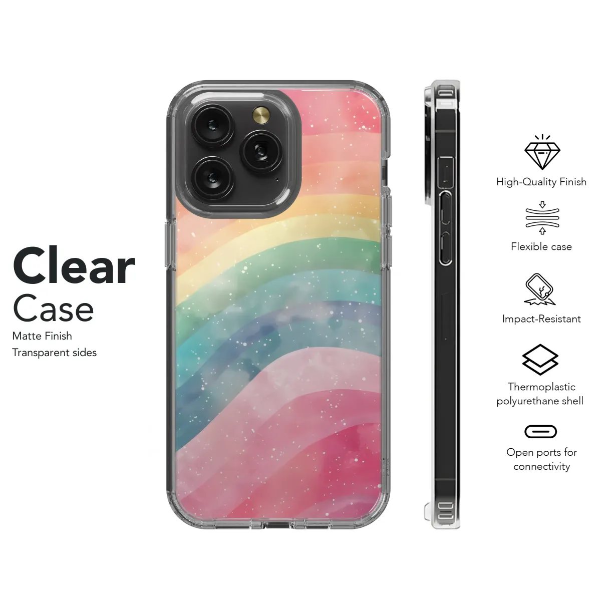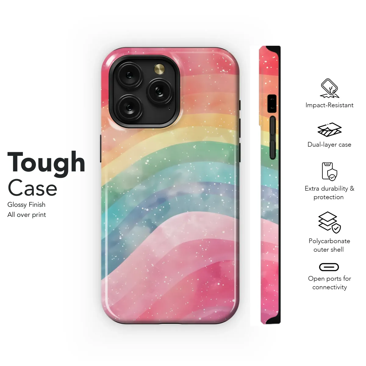 Add a touch of dreamy magic to your everyday carry with this enchanting design. Featuring a vibrant watercolor rainbow, subtly blended with a sparkling galaxy effect, this protective shell boasts a unique pastel palette of pink, orange, yellow, green, blue, and purple hues. The soft, curved lines of the rainbow create a calming visual, while the scattered white speckles add a touch of celestial wonder. This beautiful artwork is perfect for those who appreciate a whimsical, colorful, and slightly ethereal aesthetic. It's a stylish statement piece that's sure to turn heads and brighten your day. High-quality printing ensures vibrant colors and lasting protection for your device. Bring a bit of rainbow stardust into your world – order yours today! This design makes a wonderful gift for friends, family, or yourself. Express your individuality with a personalized accessory that reflects your unique style and love for all things magical and bright. Search terms: rainbow, pastel, watercolor, galaxy, stars, magical, dreamy, whimsical, colorful, phone accessory, personalized gift.