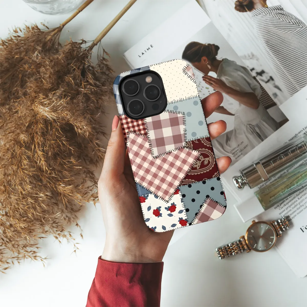 Showcase your unique style with this charming patchwork design, featuring a delightful mix of gingham, polka dots, floral prints, and paisley patterns. Each meticulously stitched square creates a visually stunning collage, reminiscent of a cherished handmade quilt. The rich color palette of deep blues, warm reds, and creamy off-whites evokes a sense of rustic charm and timeless elegance. This captivating print adds a touch of vintage-inspired artistry to your everyday essentials, making a statement wherever you go. The high-quality print ensures vibrant colors and exceptional detail that will last. This design is perfect for those who appreciate handcrafted aesthetics and desire a unique, eye-catching accessory to reflect their individuality. It's a great gift for yourself or someone who loves unique, beautifully designed items. Order yours today and experience the charm of this handcrafted-inspired design! This durable and stylish print offers a unique way to express your personality and add a touch of whimsy to your life. Perfect for adding a touch of vintage charm to your accessories, this pattern is sure to turn heads.