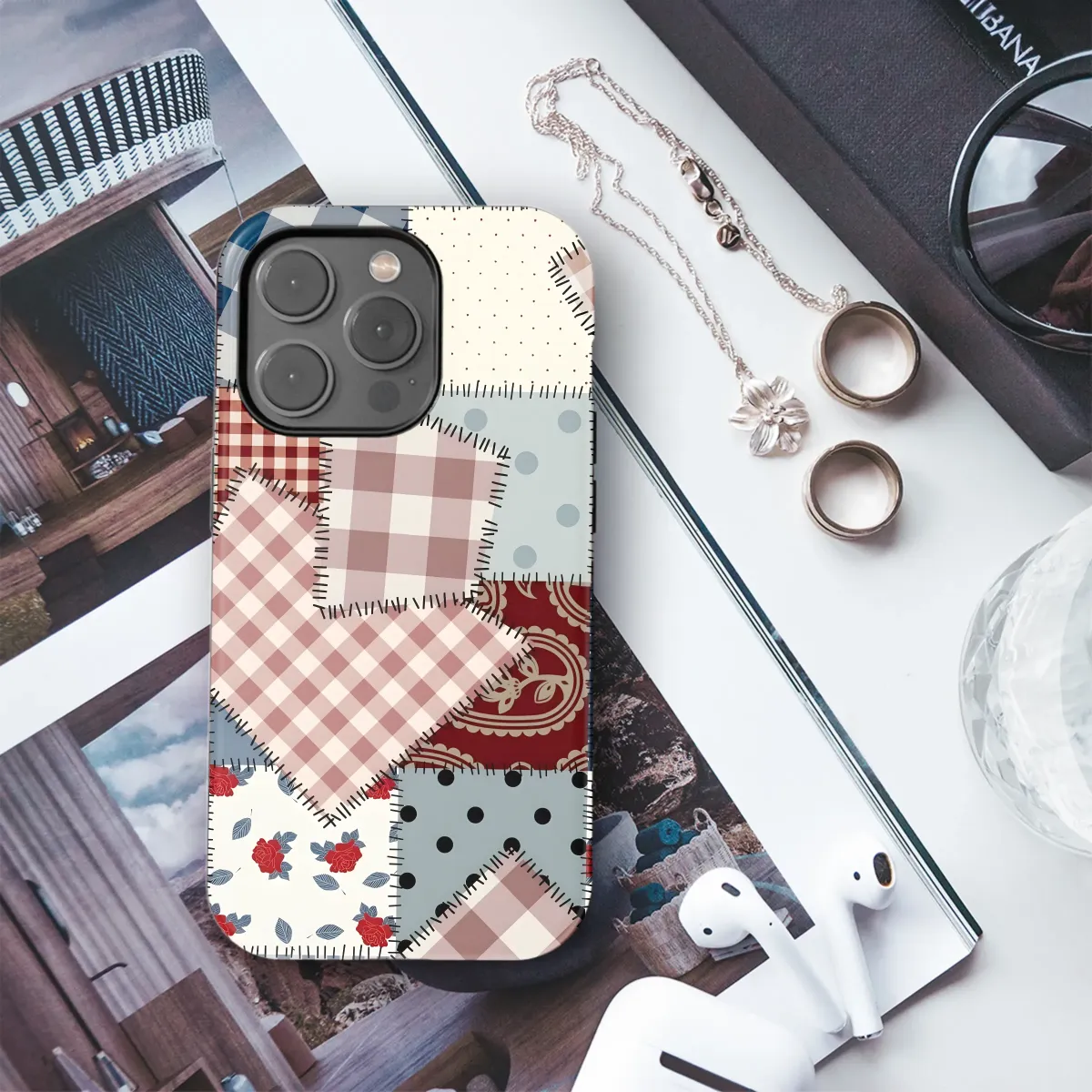 Showcase your unique style with this charming patchwork design, featuring a delightful mix of gingham, polka dots, floral prints, and paisley patterns. Each meticulously stitched square creates a visually stunning collage, reminiscent of a cherished handmade quilt. The rich color palette of deep blues, warm reds, and creamy off-whites evokes a sense of rustic charm and timeless elegance. This captivating print adds a touch of vintage-inspired artistry to your everyday essentials, making a statement wherever you go. The high-quality print ensures vibrant colors and exceptional detail that will last. This design is perfect for those who appreciate handcrafted aesthetics and desire a unique, eye-catching accessory to reflect their individuality. It's a great gift for yourself or someone who loves unique, beautifully designed items. Order yours today and experience the charm of this handcrafted-inspired design! This durable and stylish print offers a unique way to express your personality and add a touch of whimsy to your life. Perfect for adding a touch of vintage charm to your accessories, this pattern is sure to turn heads.