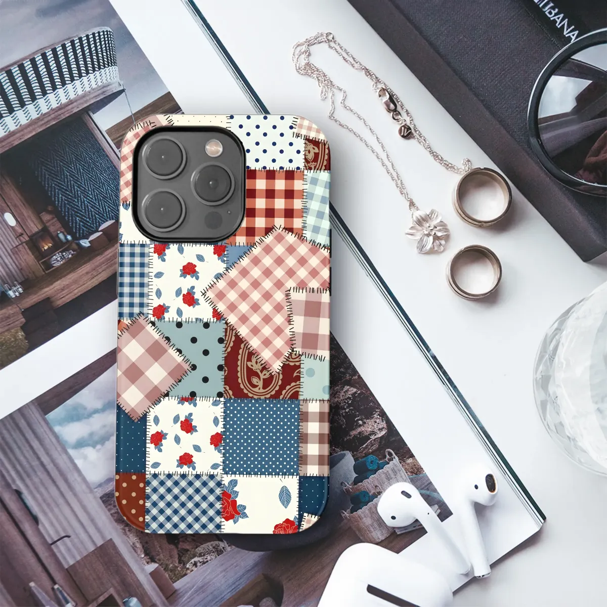 Showcase your unique style with this charming patchwork design, perfect for adding a touch of rustic elegance to your everyday essentials. This vibrant print features a captivating blend of gingham checks, polka dots, floral motifs, and paisley patterns, all meticulously stitched together to create a captivating collage. The rich color palette of deep reds, navys, and creams evokes a sense of vintage charm and cozy comfort. This eye-catching design is sure to turn heads and spark conversations. Its versatile aesthetic complements a variety of personal styles, making it an ideal accessory for individuals who appreciate handcrafted details and unique designs. The high-quality print ensures that the vibrant colors and intricate patterns will remain vivid and clear, adding a touch of personality to your device. Add a touch of handcrafted beauty to your life with this timeless and stylish design, a perfect blend of nostalgia and modern appeal. This design makes a thoughtful and unique gift or a perfect treat for yourself. Order yours today and experience the joy of personalized style!