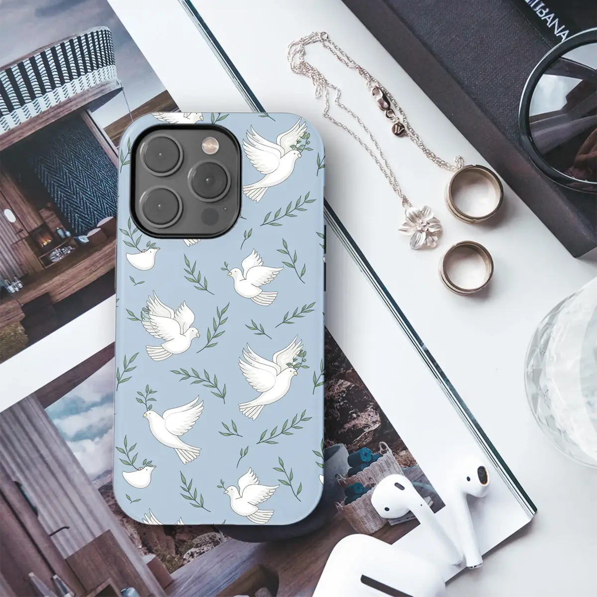Embrace a sense of tranquility with this elegant peace dove design. The pattern features beautifully illustrated white doves in flight, each carrying a delicate green olive branch, a timeless symbol of hope and serenity. Set against a calming light blue background, this nature-inspired botanical pattern creates a peaceful and sophisticated aesthetic, perfect for anyone who appreciates symbolic art and gentle imagery.