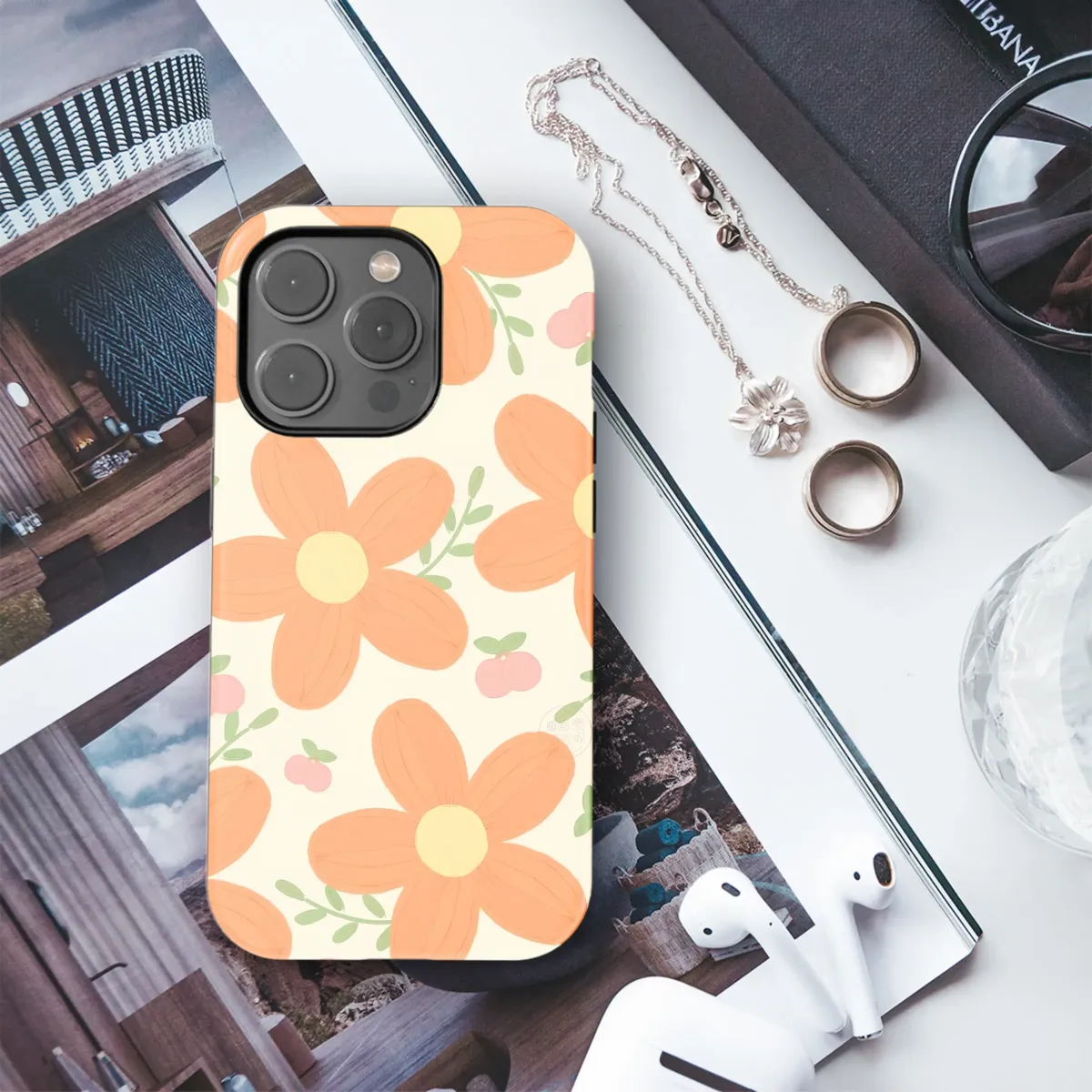 Wander into a sun-drenched daydream with this enchanting floral pattern, a perfect piece of art to personalize your most-used accessory. Cheerful, groovy orange blossoms unfold across a warm, creamy canvas, each petal hand-drawn with a soft texture that feels both nostalgic and fresh. This whimsical garden design captures the pure, simple joy of a perfect summer afternoon spent among blooming flowers and ripe fruit. The five-petaled flowers, with their sunny yellow centers, radiate warmth and positive energy, instantly brightening your day. Dotted playfully between the blooms are clusters of tiny, blush-pink peaches, their delicate green leaves adding a touch of sweet innocence and life to the composition. This nature-inspired illustration embodies a gentle, retro floral charm, making it a perfect match for the cottagecore or soft girl aesthetic. It's more than just a pattern; it's a feeling of happiness and tranquility. Let this delightful orange flower and peach design wrap your favorite item in a hug of pure, unadulterated joy. It's a beautiful way to carry a little piece of sunshine with you everywhere you go and makes a thoughtful, artistic gift for her, or for anyone who appreciates unique, botanical art.