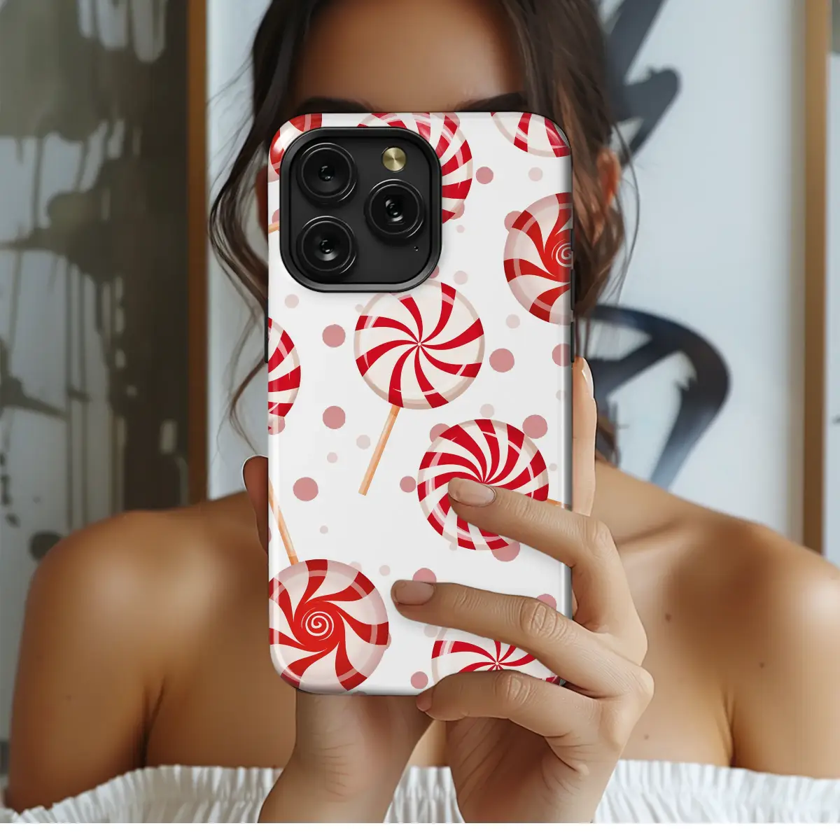 Embrace a sweet and whimsical vibe with this delightful peppermint swirl lollipop pattern. The design features classic red and white swirled lollipops scattered playfully across a clean white background, accented with soft pink polka dots for a touch of fun. This charming candy-themed graphic adds a pop of color and nostalgia, perfect for anyone with a sweet tooth.