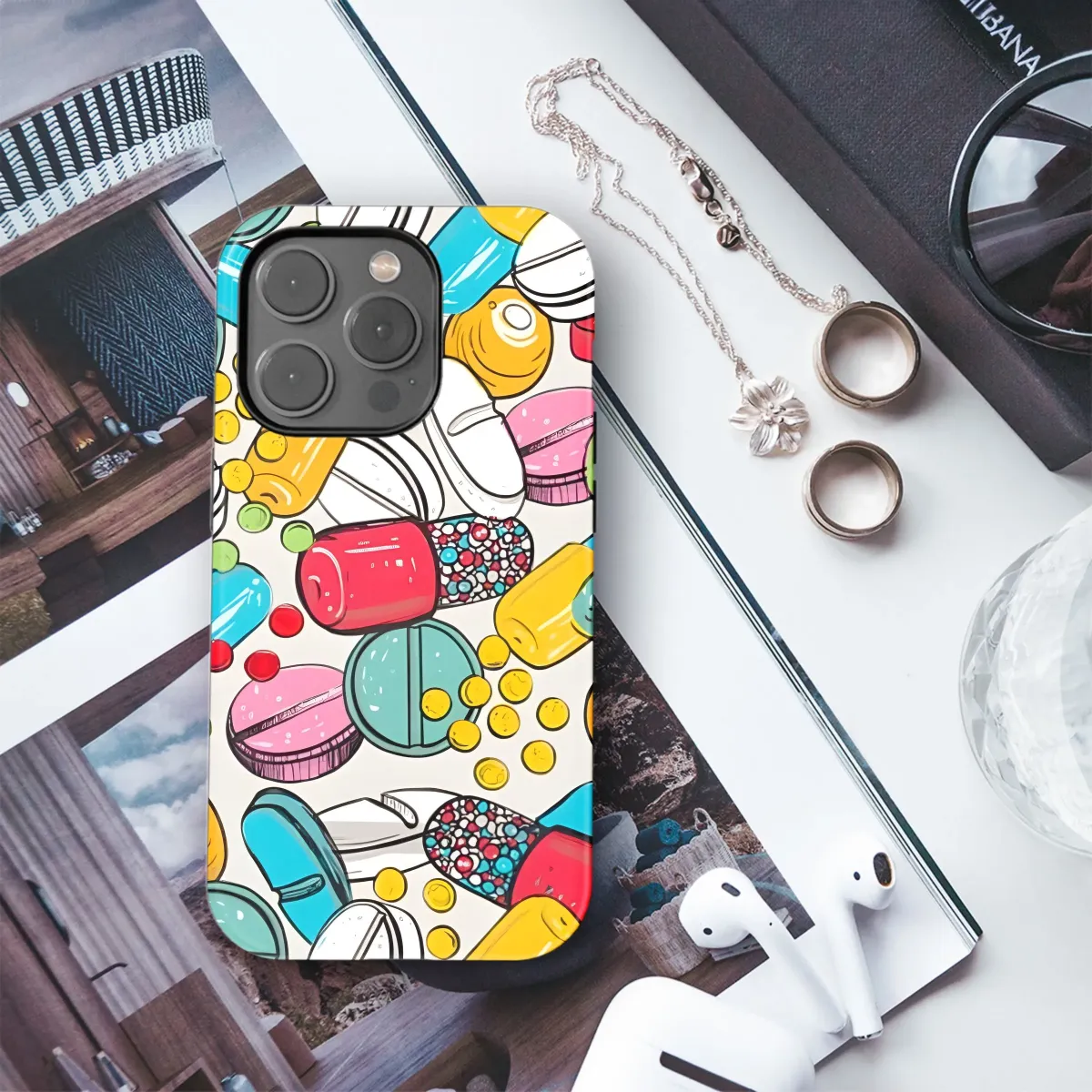 Pill and capsule pattern phone case for iPhone, Samsung, and Pixel models. Protect your phone in style with this unique design! #phonecase #pills #capsules #iphone #samsung #pixel