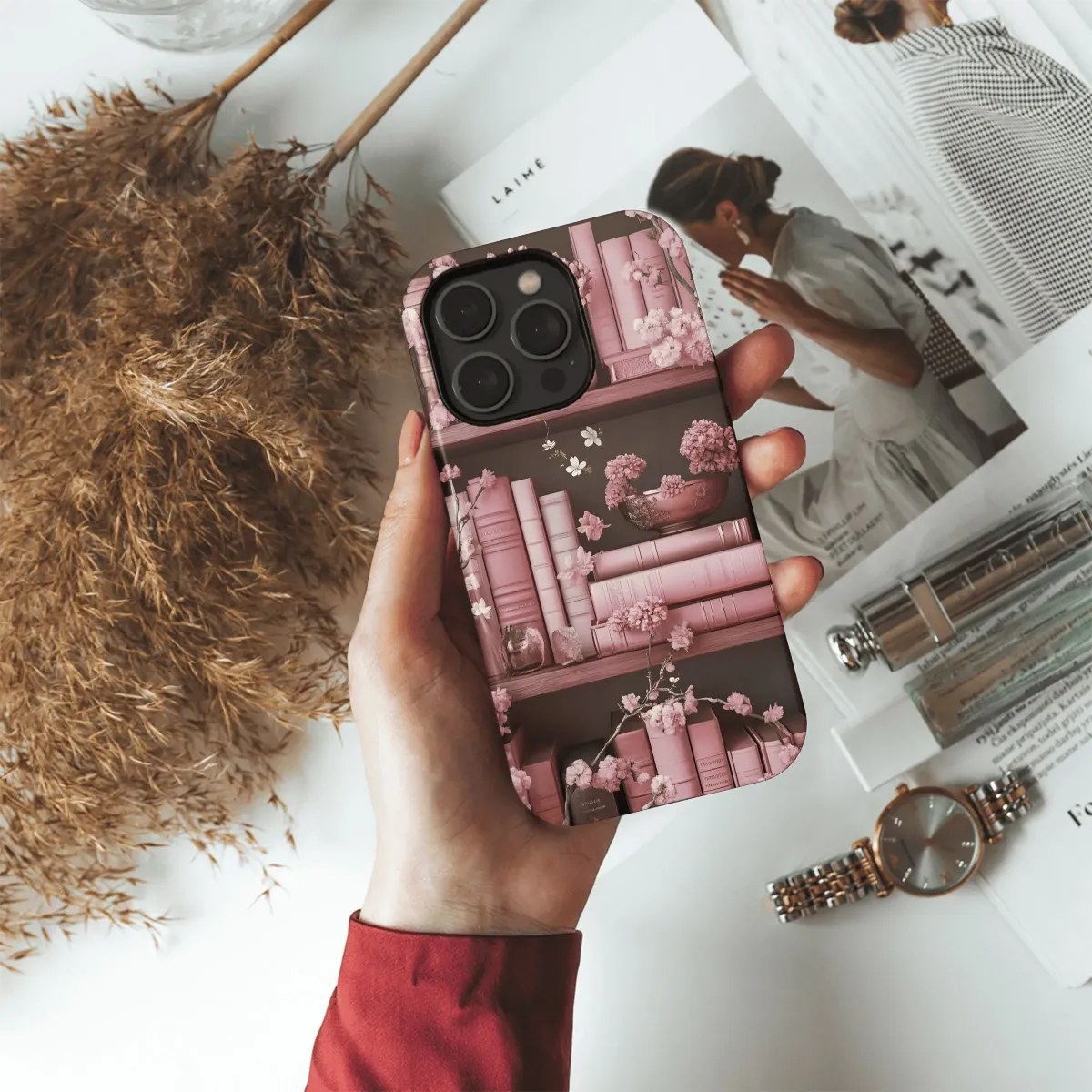 Carry a touch of literary charm with the Pink Bookcase Bloom phone case. Featuring a whimsical bookshelf design in soft pink hues, this case adds a stylish and protective layer to your iPhone, Samsung, or Pixel device (4, 6, 20).