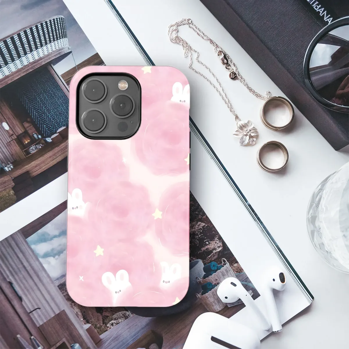 Dreamy pink bunnies float among fluffy clouds on this adorable phone case. Protect your iPhone, Samsung, or Pixel with this unique design!
