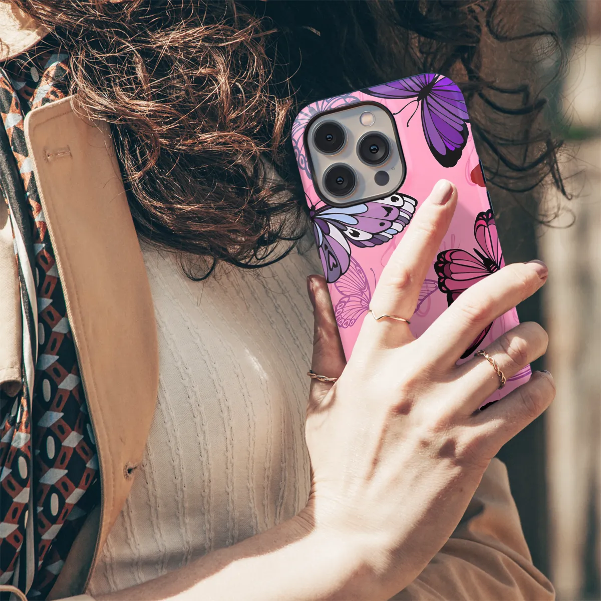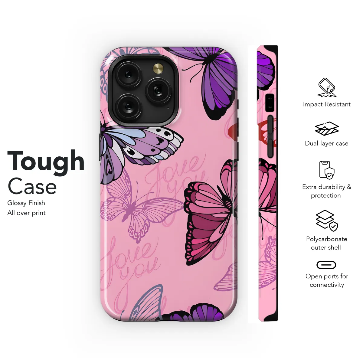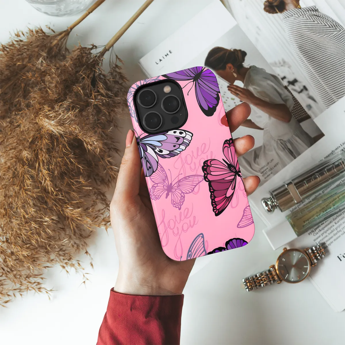 Protect your phone with style with this stunning pink butterfly phone case. Featuring a vibrant butterfly motif, this case is not only protective but also adds a touch of whimsy to your device. The durable material provides reliable protection from scratches, dings, and everyday wear and tear. Compatible with a wide range of iPhone, Samsung, and Pixel models, this case ensures a snug fit and easy access to all ports and buttons.