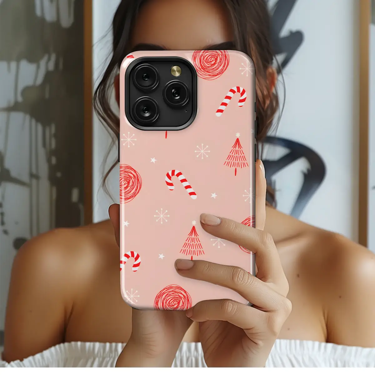 Celebrate the season with this whimsical and modern holiday pattern. The design features playful, hand-drawn style Christmas trees, classic red and white candy canes, and festive scribbles against a soft pink backdrop. Dainty snowflakes and stars are sprinkled throughout, creating a charming and cheerful winter aesthetic perfect for the holiday lover.