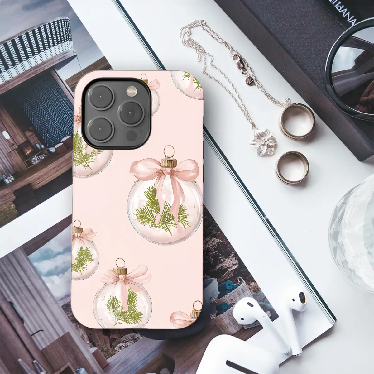 Embrace the festive season with this elegant Christmas ornament design. The pattern showcases delicate watercolor illustrations of clear glass baubles, each containing a sprig of winter pine. A soft pink bow elegantly adorns the top of each ornament, all set against a chic light pink background for a modern yet classic holiday aesthetic.