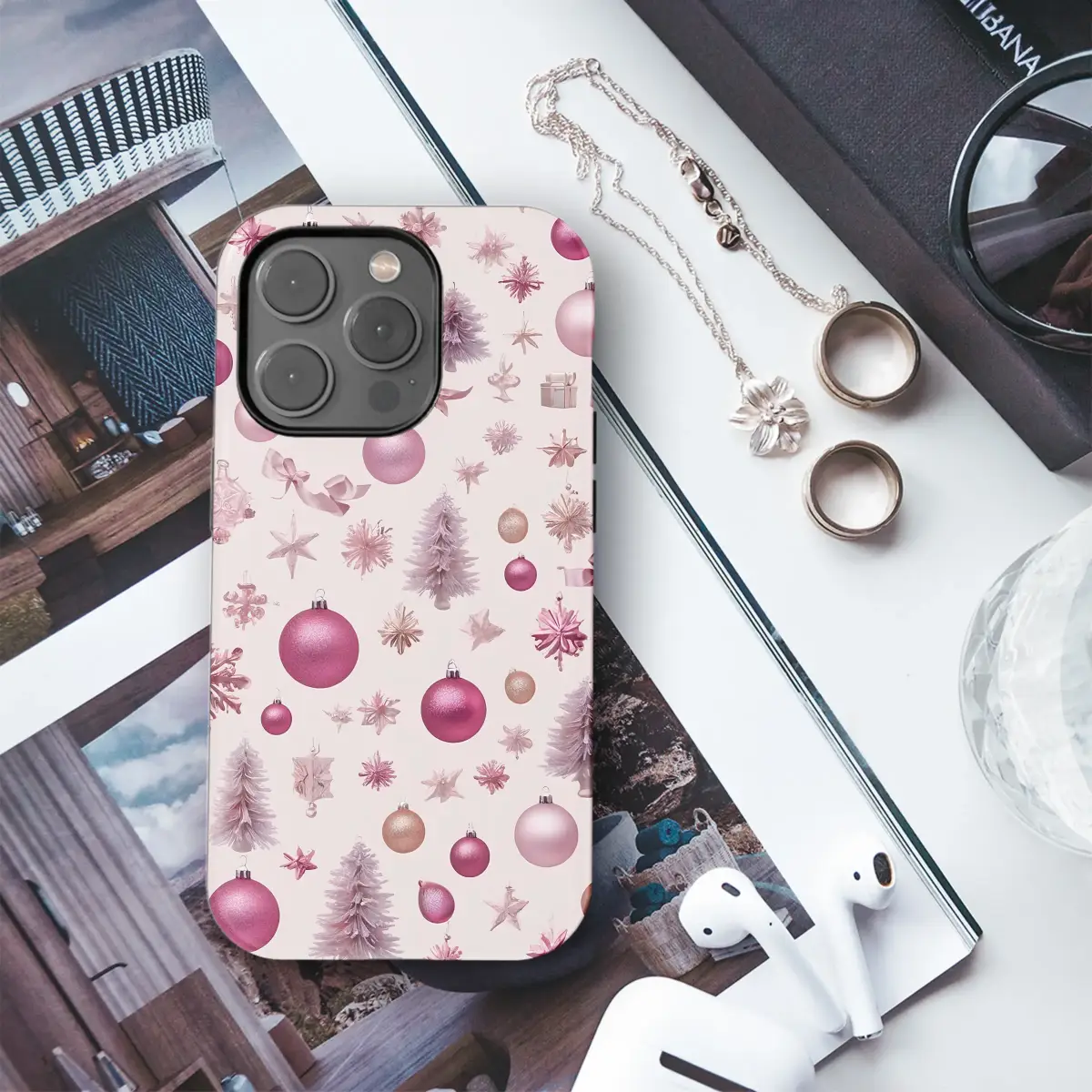Embrace the holiday spirit with this chic and festive design. A delightful pattern of shimmering Christmas ornaments, including pink and rose gold baubles, delicate snowflakes, charming miniature trees, and satin ribbons, is scattered across a soft pink background. This modern take on a classic winter wonderland theme adds a touch of playful elegance and festive cheer to your everyday style.