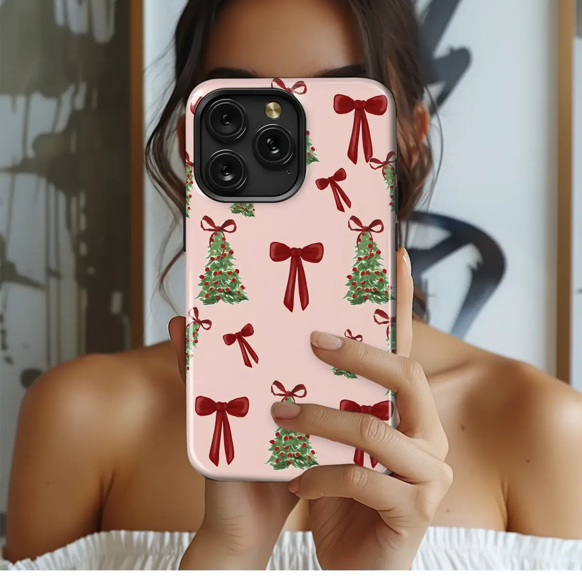 Celebrate the season in style with this festive phone case featuring a charming watercolor pattern of Christmas trees and red bows. This holiday-themed accessory offers both delightful aesthetics and reliable protection for your device against daily bumps and scratches. Inspired by classic holiday gift wrap with a modern, preppy twist, this design was hand-illustrated to bring a touch of whimsical cheer to your everyday tech. The soft pink background provides a unique, contemporary feel to the traditional red and green holiday palette. Key Features: • Materials: Durable polycarbonate shell with an optional soft TPU silicone liner • Finish: Available in a vibrant gloss or a soft matte finish • Design: UV-printed for long-lasting, fade-resistant color • Features: Slim profile, lightweight, and supports wireless charging • Compatibility: Fits iPhone models 15, 14, 13, 12, 11, and X/XR/XS Care Instructions: Wipe clean with a soft, damp cloth.