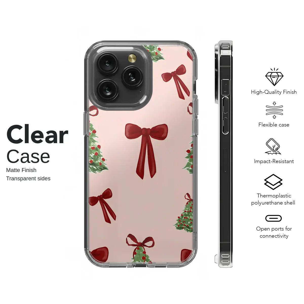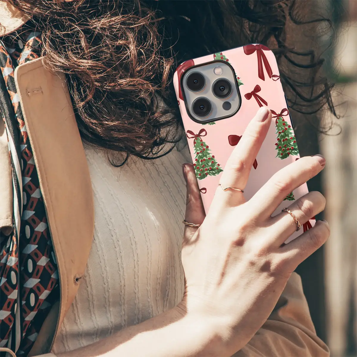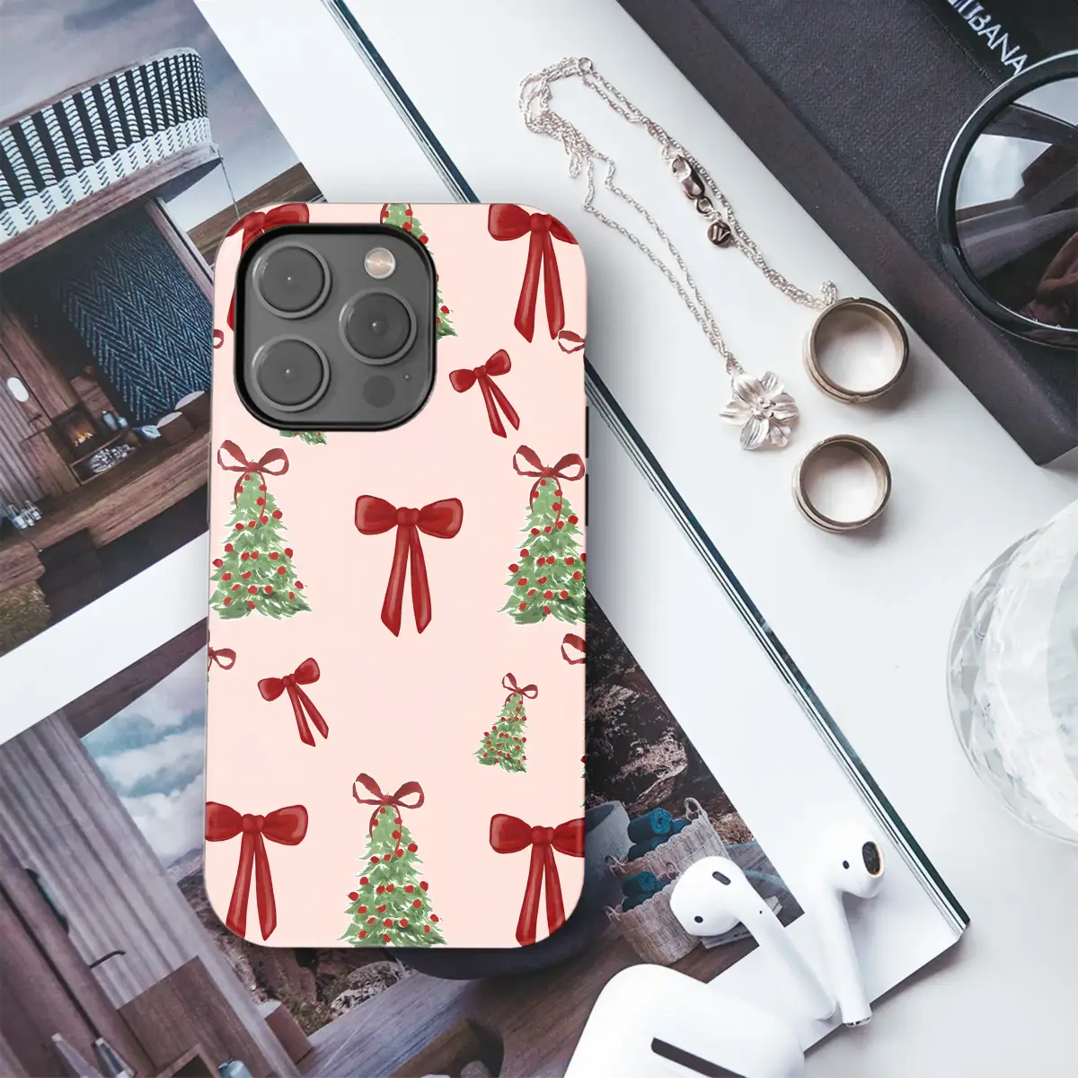 Celebrate the season in style with this festive phone case featuring a charming watercolor pattern of Christmas trees and red bows. This holiday-themed accessory offers both delightful aesthetics and reliable protection for your device against daily bumps and scratches. Inspired by classic holiday gift wrap with a modern, preppy twist, this design was hand-illustrated to bring a touch of whimsical cheer to your everyday tech. The soft pink background provides a unique, contemporary feel to the traditional red and green holiday palette. Key Features: • Materials: Durable polycarbonate shell with an optional soft TPU silicone liner • Finish: Available in a vibrant gloss or a soft matte finish • Design: UV-printed for long-lasting, fade-resistant color • Features: Slim profile, lightweight, and supports wireless charging • Compatibility: Fits iPhone models 15, 14, 13, 12, 11, and X/XR/XS Care Instructions: Wipe clean with a soft, damp cloth.