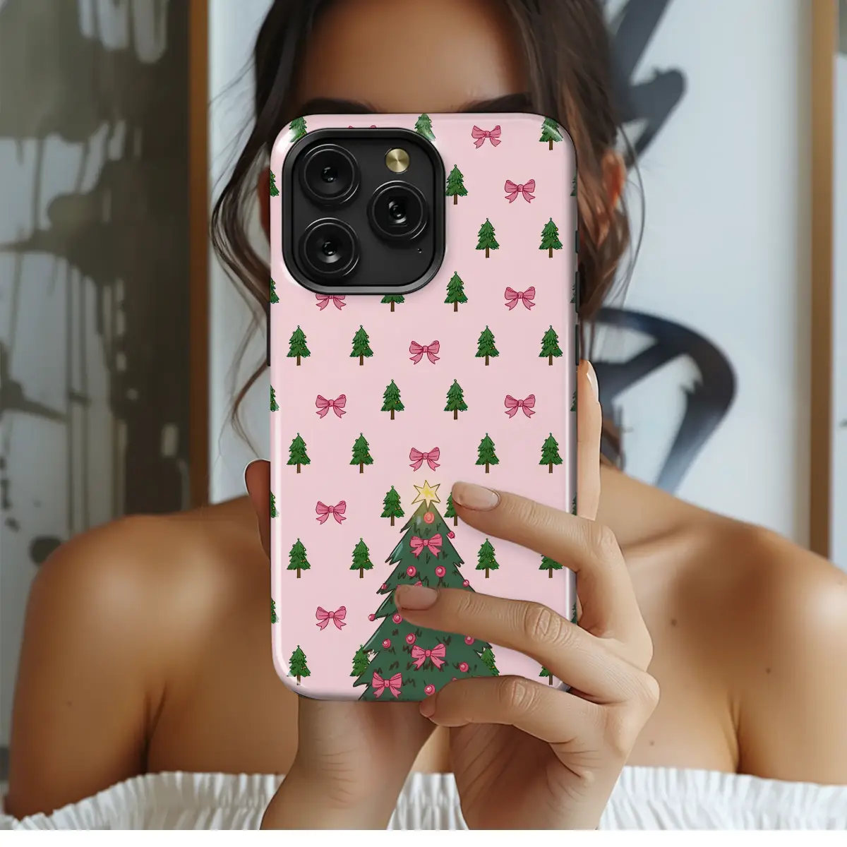 Embrace the holiday spirit with this whimsical and festive design. A charming pattern of evergreen Christmas trees and sweet pink bows dances across a soft pink background. The centerpiece is a beautifully decorated tree, adorned with more pink bows, ornaments, and topped with a shining star, creating a cheerful and stylish look for the season.