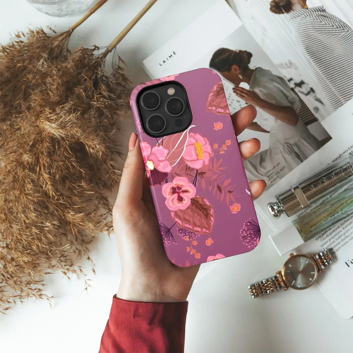 Adorn your cherished item with this captivating botanical artwork, a truly enchanting expression of nature's beauty translated into a stunning visual display. This intricate pattern features a lavish array of vibrant pink orchids, their delicate petals unfurling with grace, alongside soft, romantic peony-like blossoms boasting rich, deep centers and cheerful golden accents. Interspersed throughout are unique spiky floral elements in darker hues, adding intriguing texture and visual depth to the composition. The lush design is set against a sophisticated background, allowing the rich tapestry of colors to truly pop. A palette of deep magentas, soft mauves, warm pinks, and subtle earthy tones creates a harmonious and elegant aesthetic. This artistic creation evokes the feeling of a lush, exotic garden, bringing a touch of sophisticated tropical charm to whatever it embellishes. It's a perfect choice for anyone seeking to personalize an essential accessory with a touch of artistic flair and natural elegance. The careful rendering of each petal and leaf showcases the artistry behind this exclusive print, making it a unique statement piece. Elevate your personal style with this exquisite pattern, designed to transform an everyday object into a beautiful work of art you can carry with you, reflecting a passion for vibrant florals and refined design. It's more than just a pattern; it's an artistic enhancement for a beloved item.