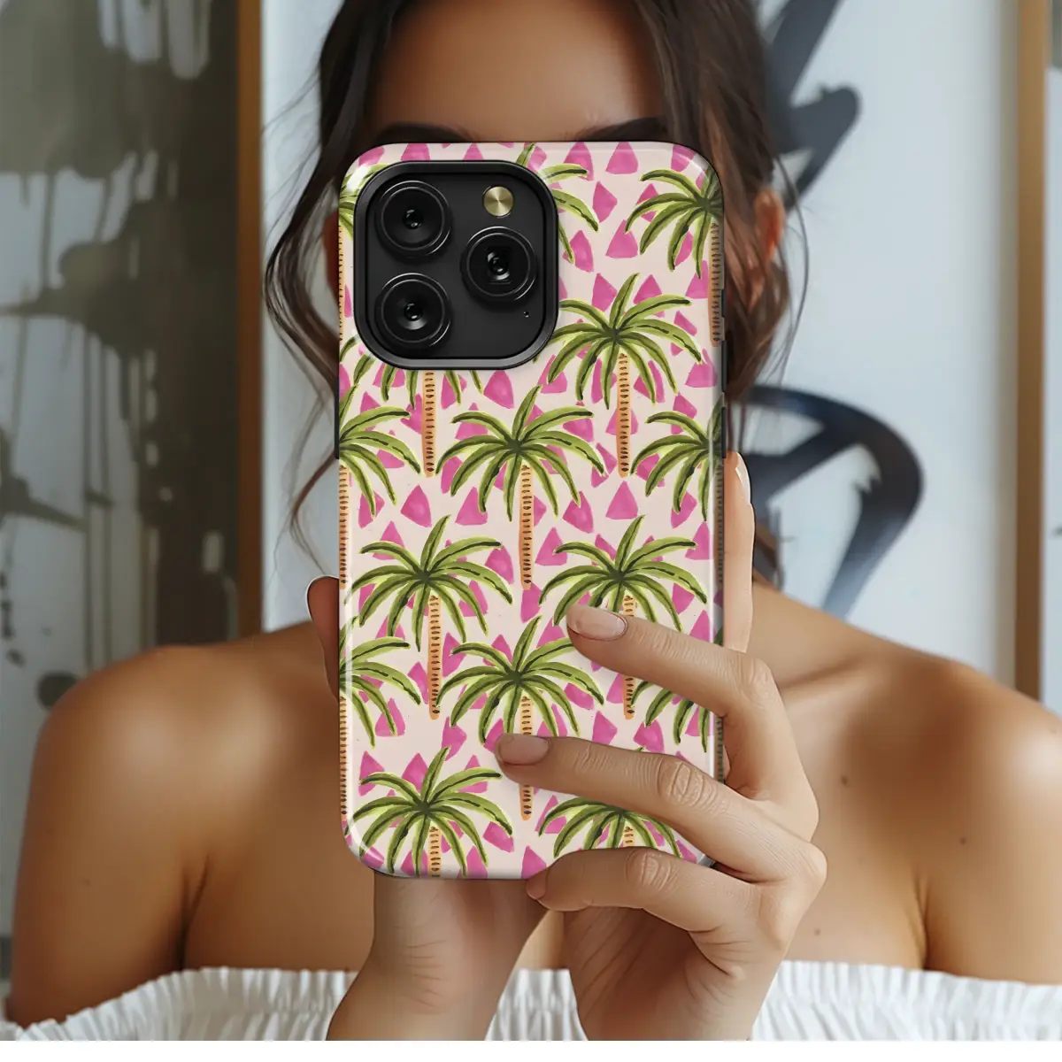 Escape to paradise with this vibrant tropical design! This playful pattern features lush green palm trees set against a backdrop of soft blush pink and bright pink geometric accents. The hand-painted style adds a unique, artistic touch, bringing a touch of island vibes to your everyday life. This eye-catching print is perfect for adding a pop of color and personality to your accessory, making it a stylish and fun statement piece. The detailed artwork and rich color palette ensure your design will be a head-turner. Bring the tropics with you wherever you go, adding a sunny disposition to your look. This design is printed with high-quality inks ensuring vibrant colors and lasting durability. It's a perfect gift for yourself or the tropical lover in your life, providing a fun and fashionable upgrade to your personal style. Add a touch of summer all year round with this unique and trendy pattern. #tropical #palm trees #pink #summer #geometric #handpainted #beach #vacation #boho #stylish #accessories #gift.
