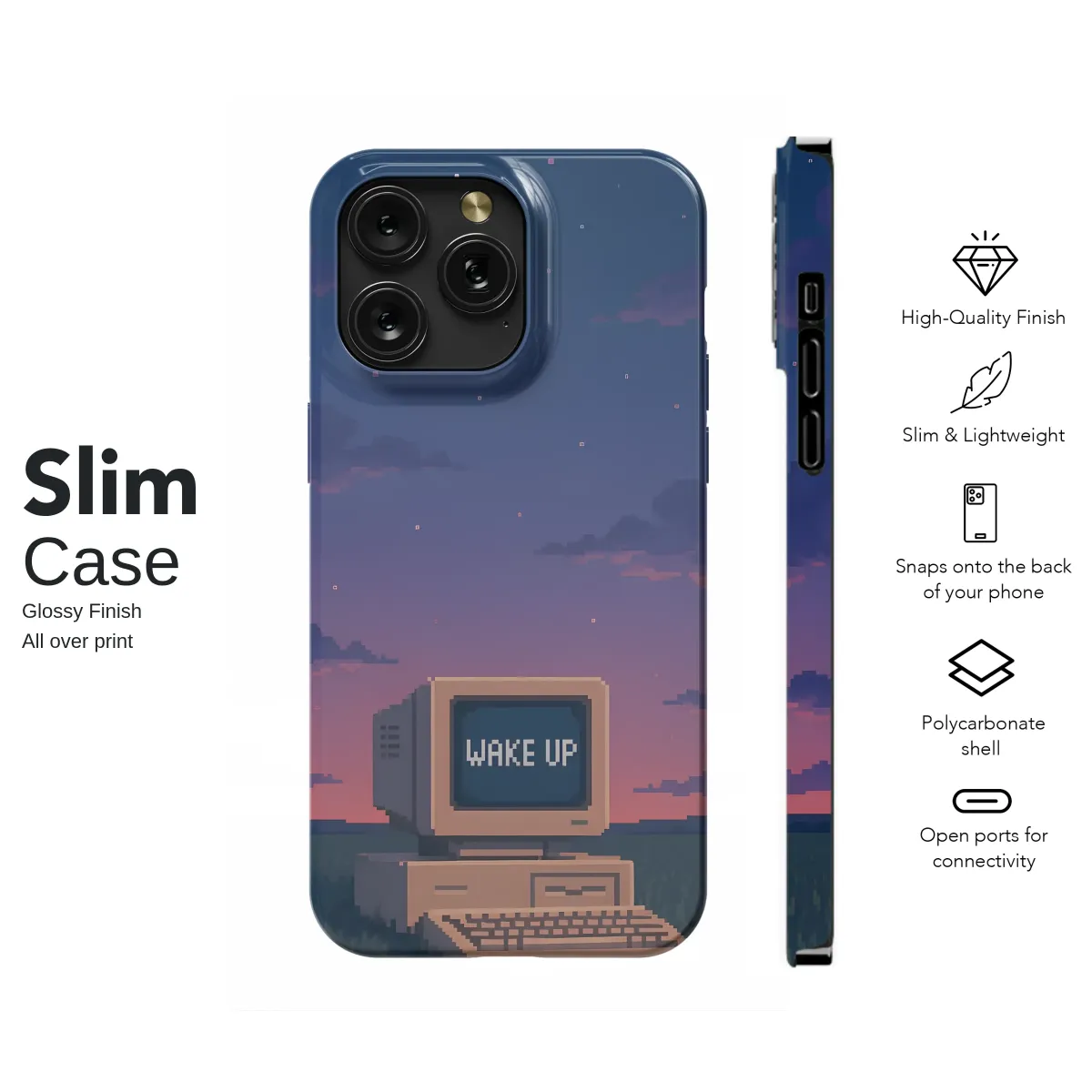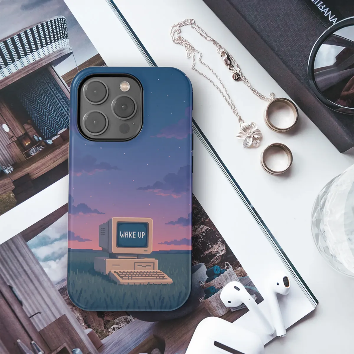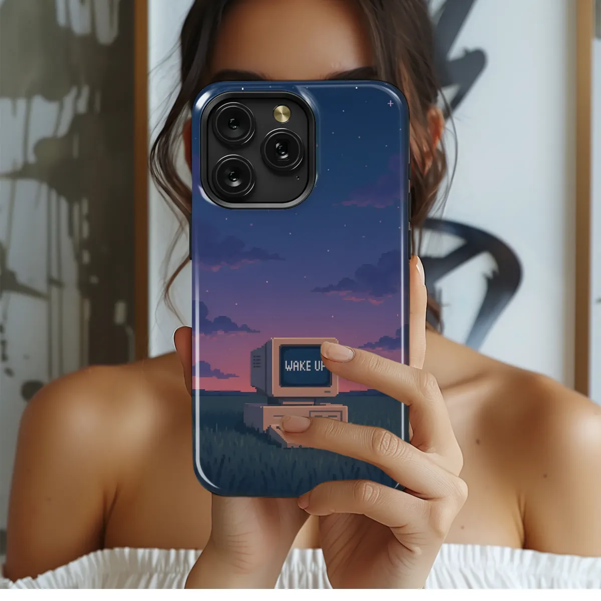 Step into a surreal dreamscape where nostalgia and technology collide. This captivating pixel art design features a solitary, retro computer resting in a silent, grassy meadow under a vast, twilight sky. Hues of dusk purple and soft pink paint the pixelated clouds as a sea of tiny stars begins to glitter in the deep indigo above. This 8-bit artwork captures a moment of quiet contemplation, blending the digital world with the profound tranquility of a natural landscape. On the glowing screen, a simple yet profound message appears: 'WAKE UP.' Is it a call to action, a reminder of reality, or an entry point into a digital dream? Perfect for lovers of retro gaming, vaporwave aesthetics, and surreal art, this design transforms your favorite accessory into a piece of thought-provoking lo-fi beauty. It's a unique statement piece for the modern dreamer, a perfect gift for the tech enthusiast with a poetic soul, or anyone who finds beauty in the quiet moments between worlds. Let this enchanting scene be your daily reminder to stay present, question reality, and find the magic in the glitch.