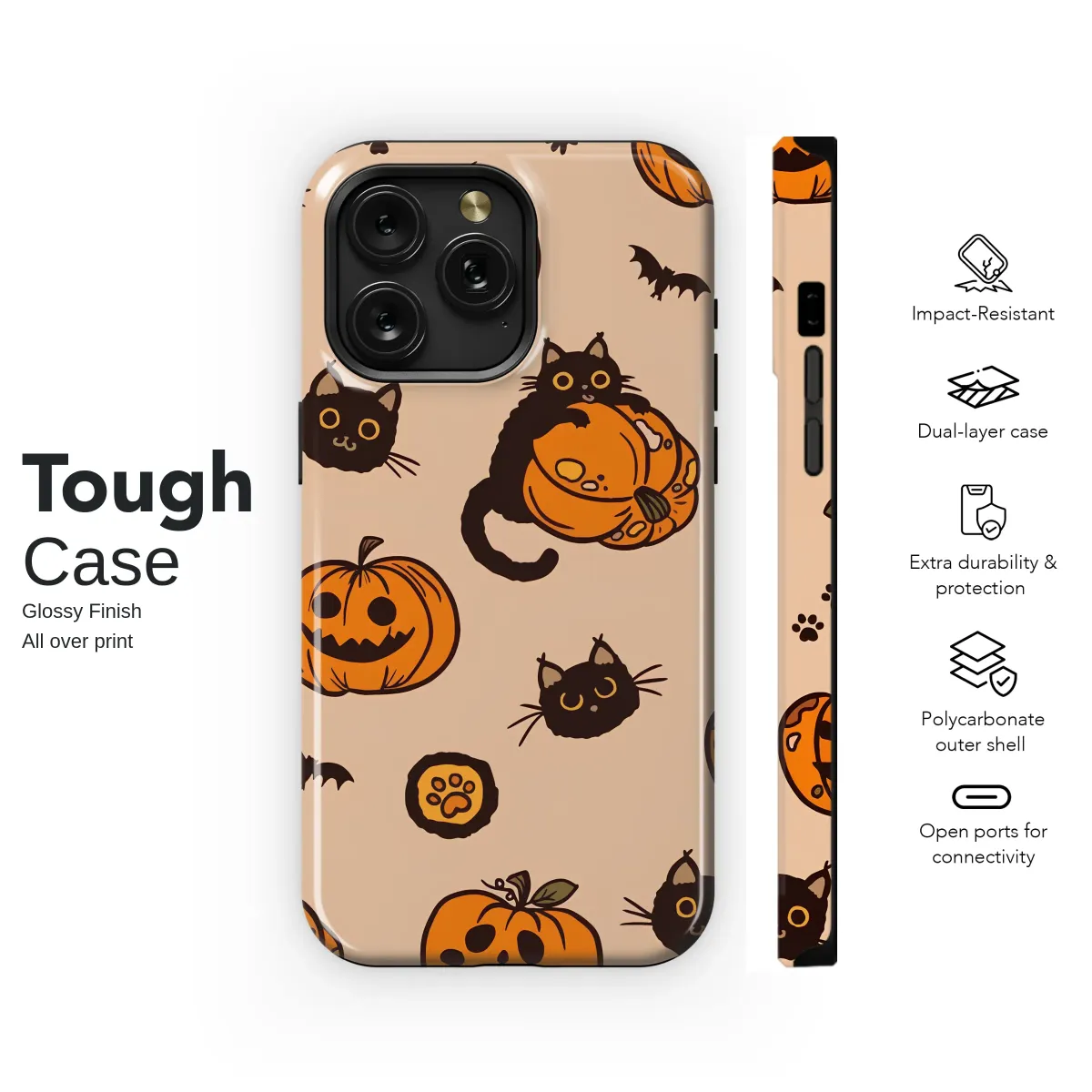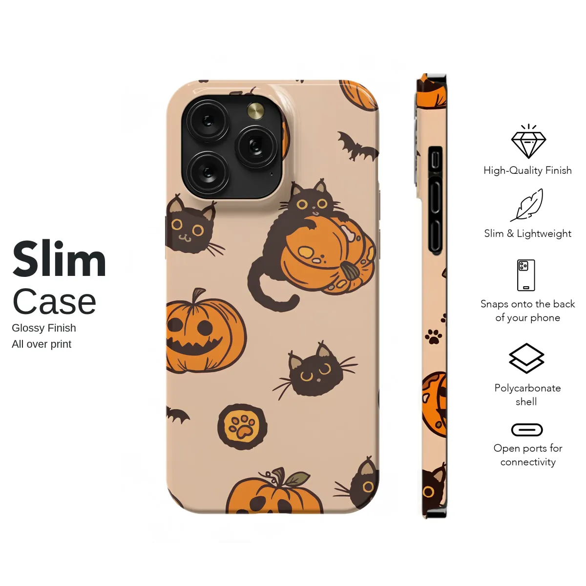 Step into a world where autumn magic never ends with this enchanting design that captures the heart of spooky season. Imagine a whimsical pumpkin patch bathed in the soft glow of a harvest moon, where mischievous black cats with wide, curious eyes play hide-and-seek among smiling jack-o'-lanterns. Each little feline is full of personality, some peeking out shyly while others lounge playfully atop their favorite gourd. Tiny bats flutter through the air, and adorable paw prints dance across the warm, peach-hued background, telling a story of midnight adventures. This isn't just a pattern; it's a celebration of all things cozy, cute, and a little bit spooky. The charming hand-drawn style brings a touch of nostalgic Halloween spirit to your everyday essentials, making it the perfect accessory for any lover of fall, feline friends, and the delightful thrill of All Hallows' Eve. Let this sweet, spooky illustration wrap your favorite gear in the warmth and wonder of the most magical time of the year, adding a dash of personality and autumnal joy wherever you go.