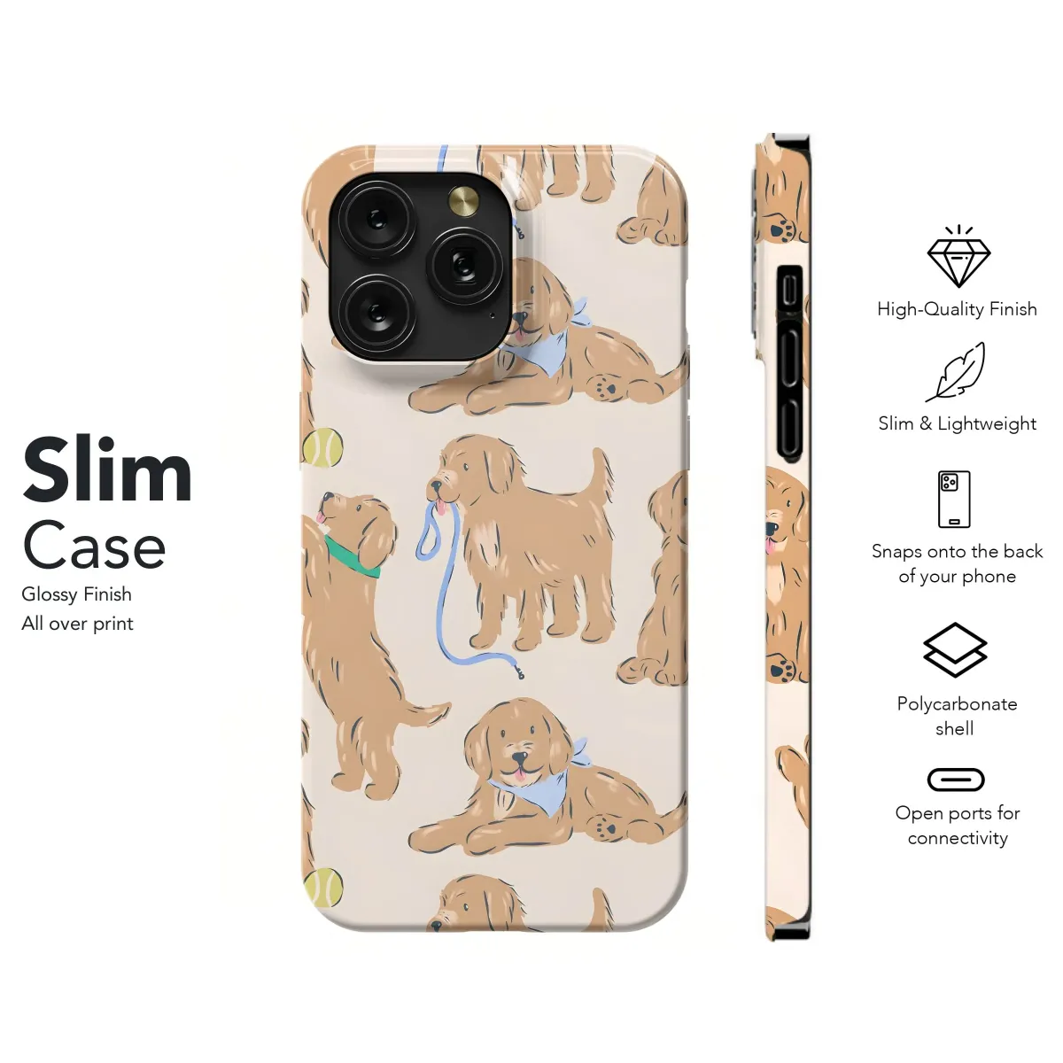 This adorable Golden Retriever print is perfect for adding a touch of puppy love to your everyday life! Featuring a playful pattern of cute, cartoon-style Goldens in various poses – some sitting pretty with their tongues out, others ready for a walk with leashes, and a few even striking a pose with their favorite tennis balls. This delightful design captures the joyful spirit of these beloved dogs. Ideal for dog lovers, Golden Retriever enthusiasts, and anyone looking to add a touch of whimsy to their accessories. The soft, neutral background makes this a versatile design that will complement any style. Express your love for furry friends with this charming and fun-loving puppy pattern design. Perfect for those who appreciate dog art and want to showcase their passion for canine companions. This playful and cute design captures the essence of puppy love.